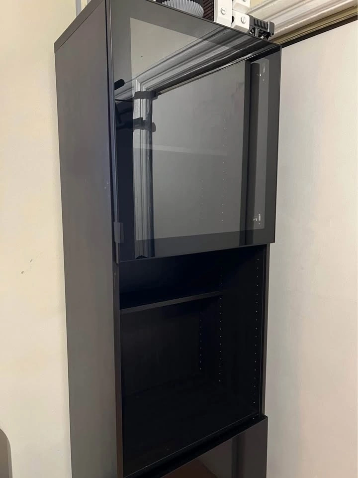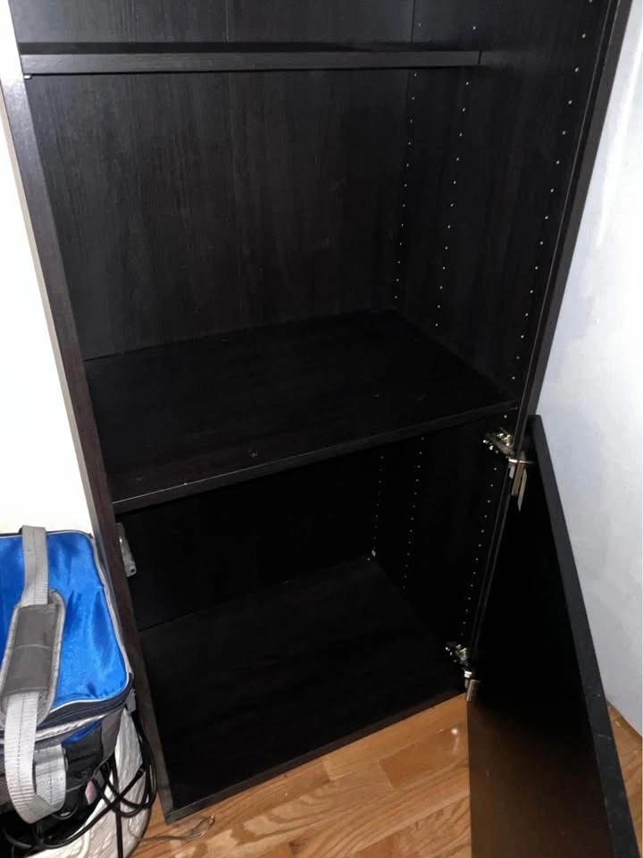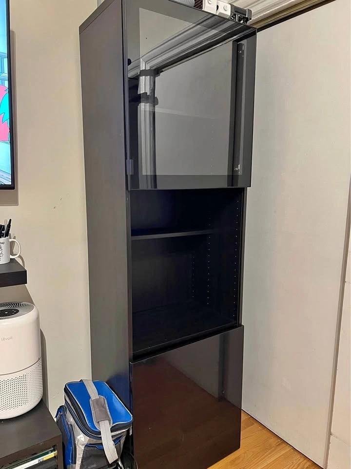 Great condition. Includes 2 doors, one glass and one shiny black, and 4 shelves. Two deep shelves divide into three sections, and there are two smaller shelves.