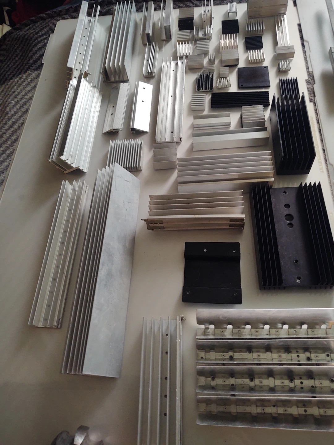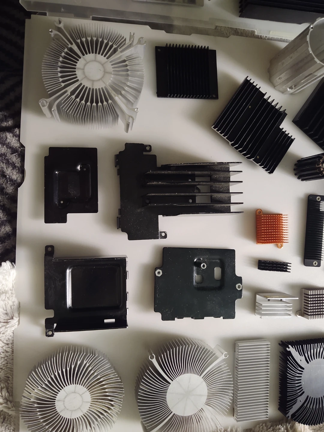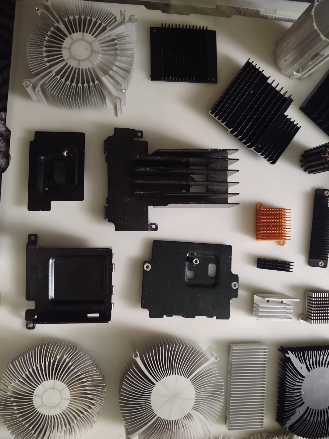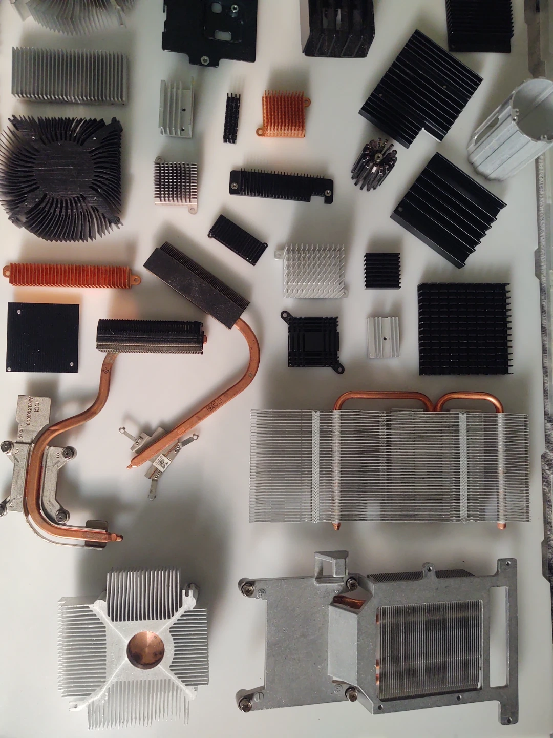 A large collection of various computer heatsinks and fans, made of aluminum and copper. Includes many different sizes and shapes for cooling components. Perfect for DIY computer builds or repairs!
