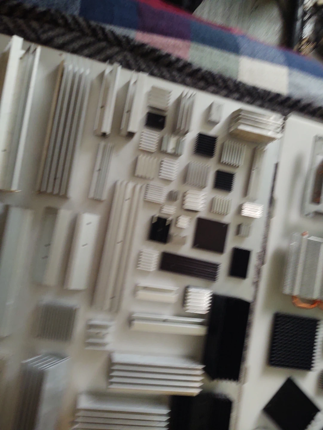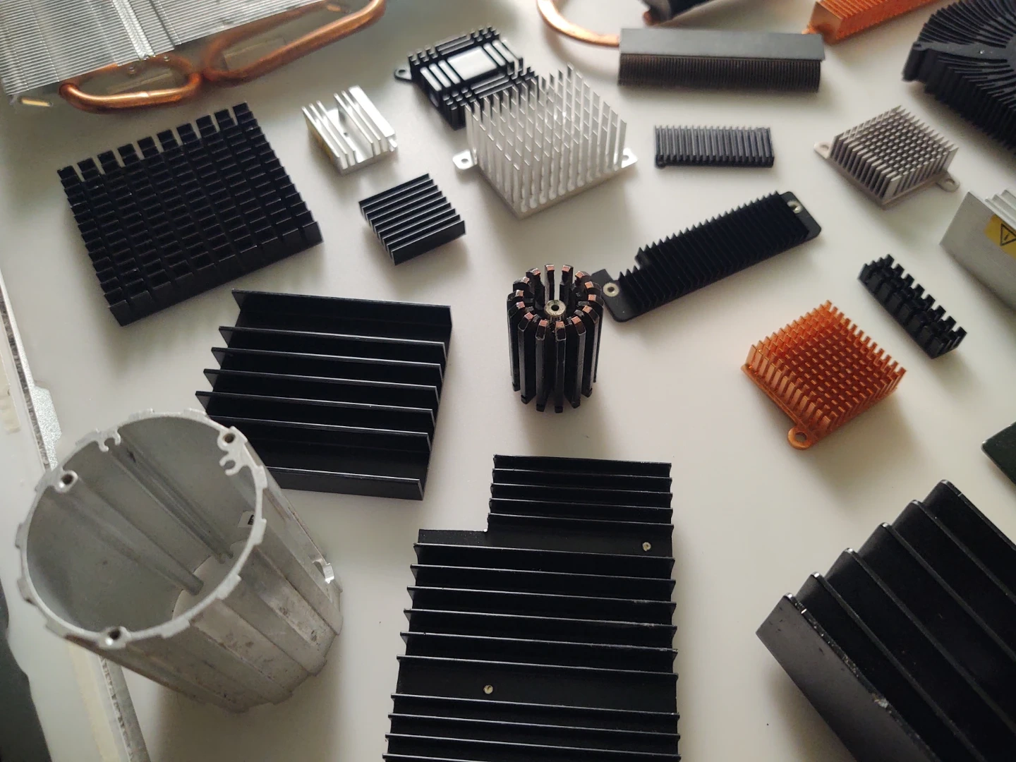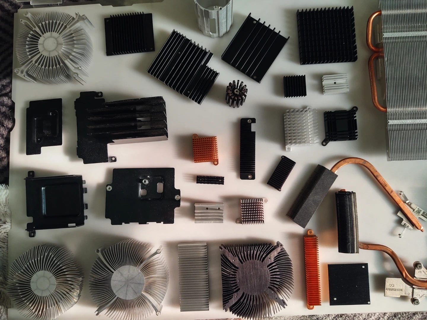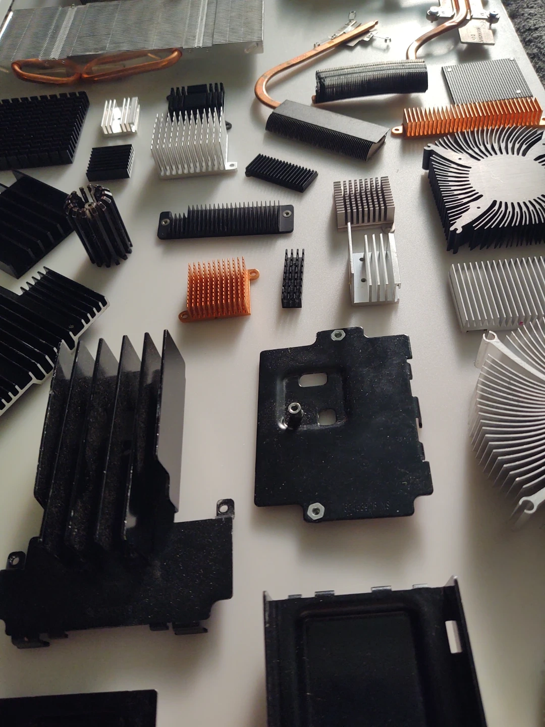 A large collection of various computer heatsinks and fans, made of aluminum and copper. Includes many different sizes and shapes for cooling components. Perfect for DIY computer builds or repairs!