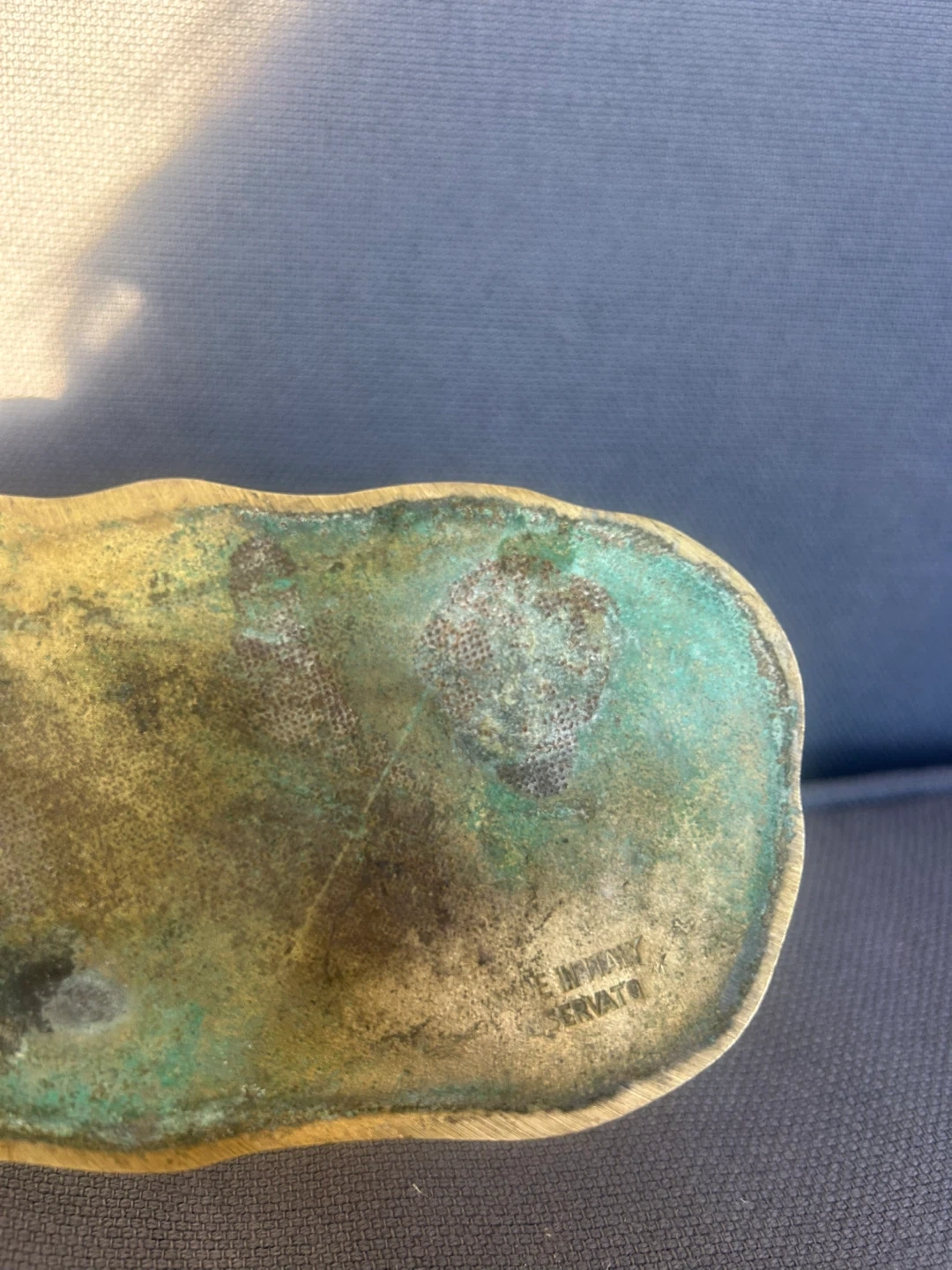 Beautiful stylized long-neck design with original aged patina. Heavy, solid brass with natural verdigris on the base confirming authenticity. Very decorative and perfect for MCM, eclectic, or animal-themed interiors.