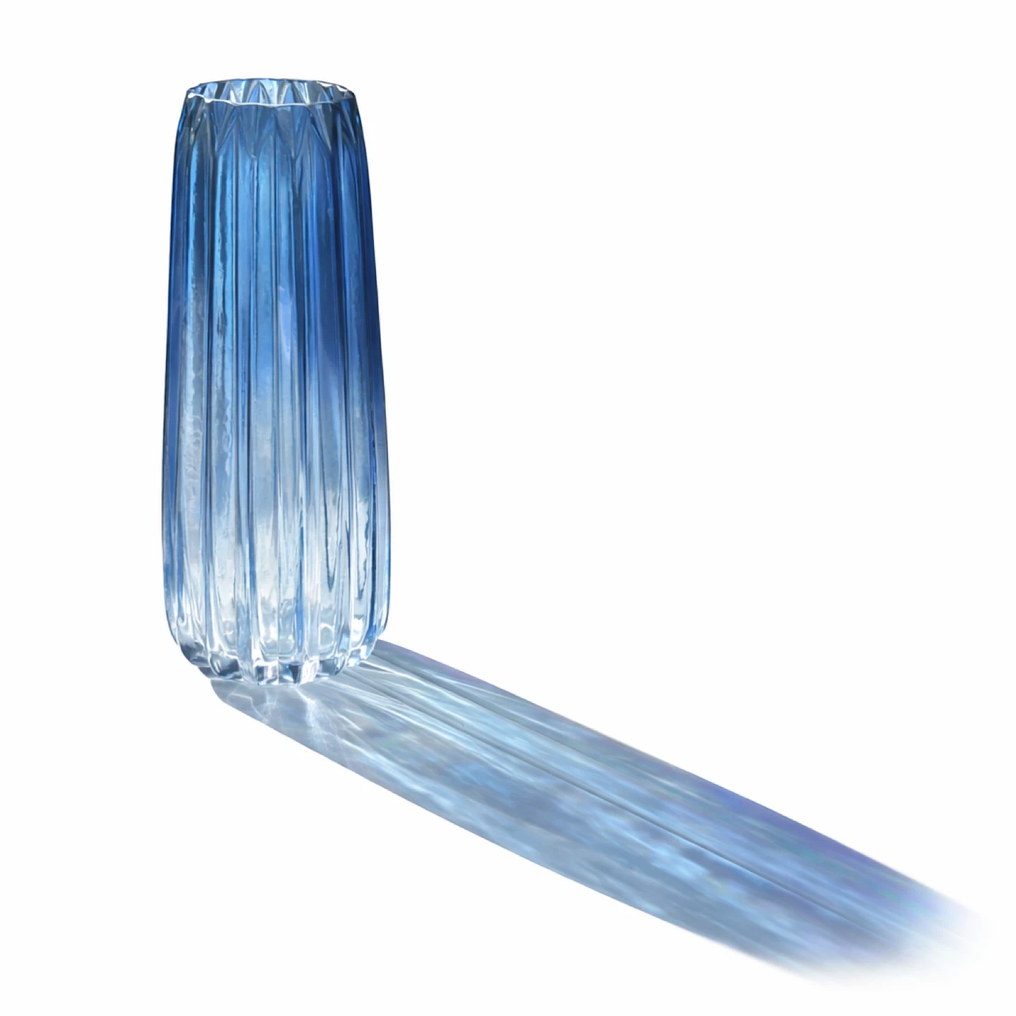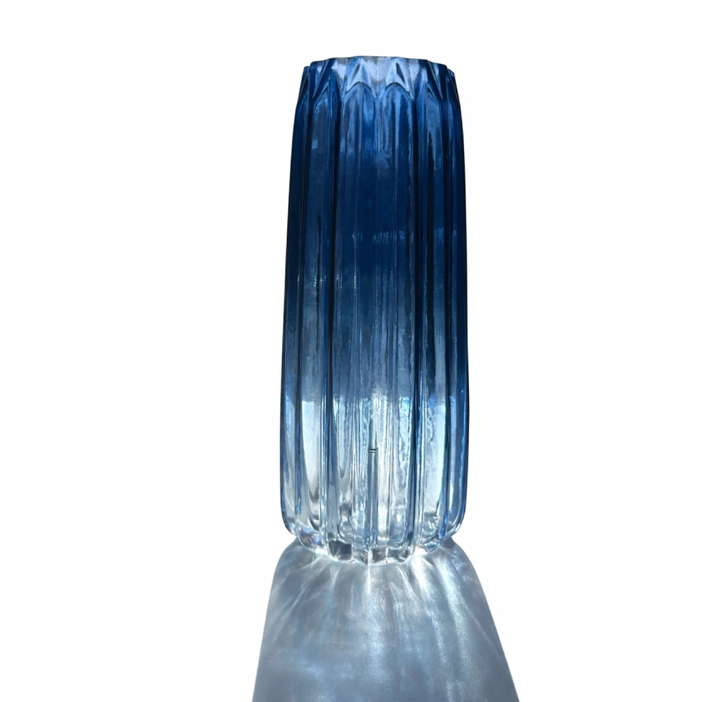 The body is evenly ribbed from base to shoulder, creating strong linear reflections and depth as light moves across the surface. The coloration shifts subtly from pale blue to near-clear depending on lighting, an effect achieved through controlled glass thickness rather than applied color. The narrow mouth and weighted lower section give the vase a poised, sculptural presence, suitable for display with or without stems.