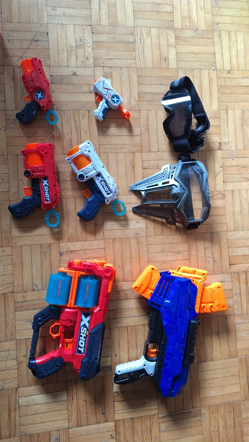 This bundle includes several X-Shot and Nerf blasters, along with protective goggles. The blasters are made of plastic in various colours. It's a fun set for active play!