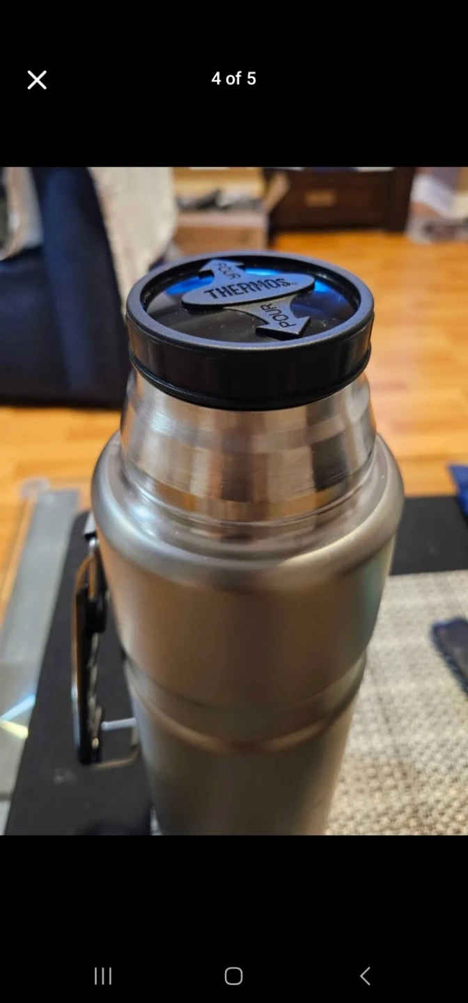 Thermos stainless steel insulated flask. Keeps drinks hot or cold for hours. Durable metal construction with a convenient carrying handle. Perfect for day trips and outdoor adventures!
