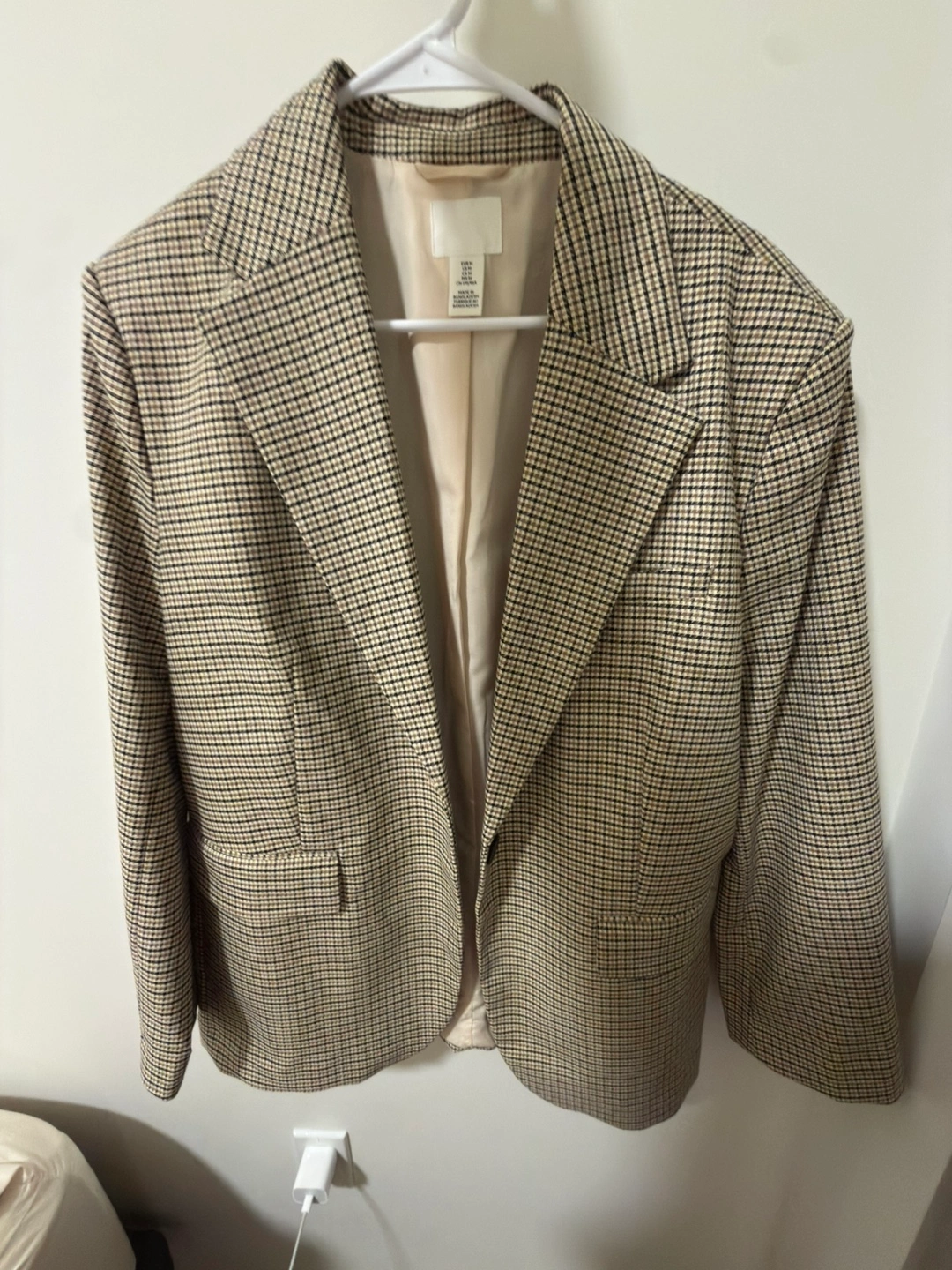 New, never used. This H&M blazer features a classic houndstooth pattern. It's a size medium, with a smooth lining. Perfect for layering over outfits, it adds a touch of sophisticated style. Size M- oversized