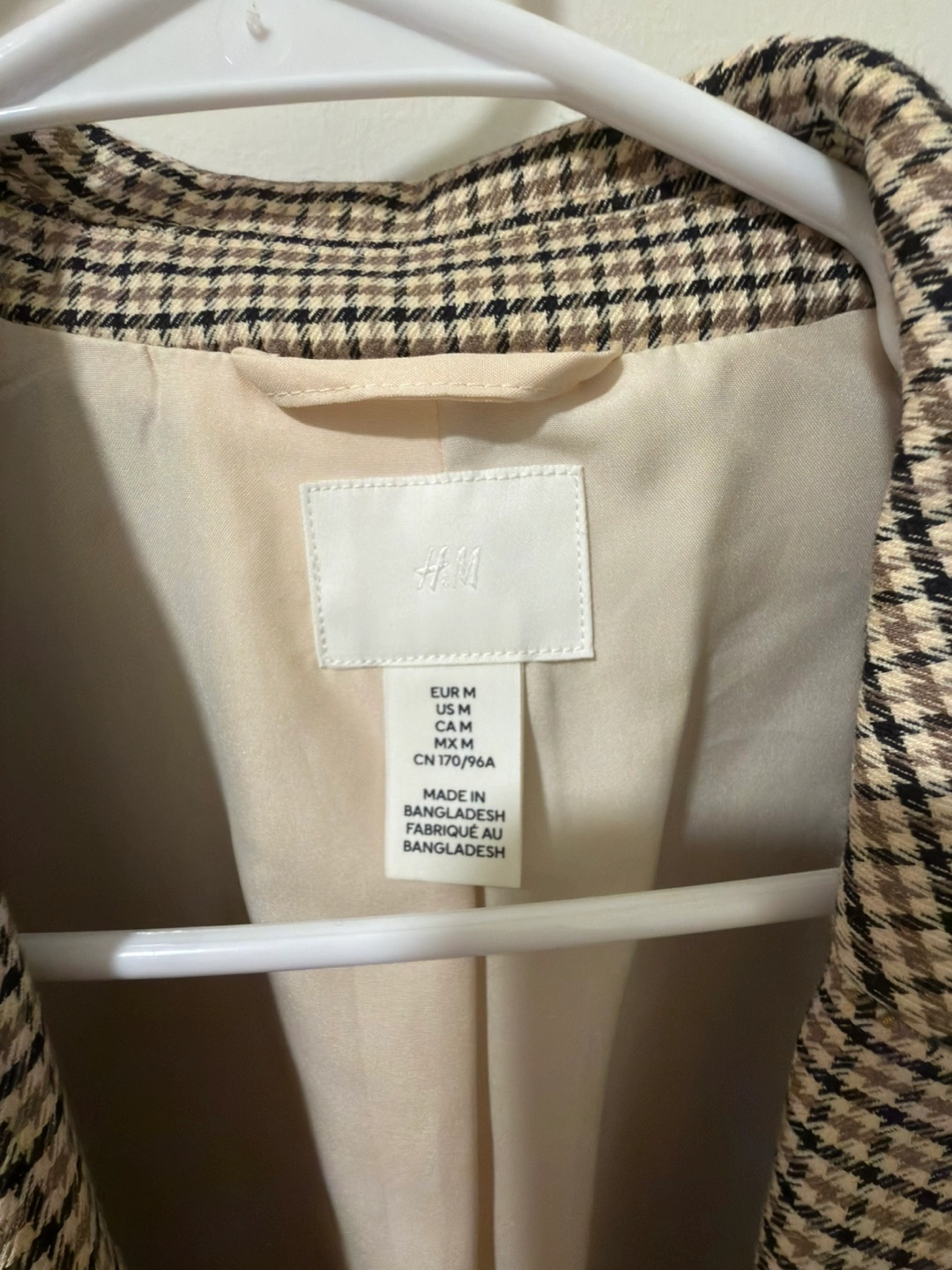 New, never used. This H&M blazer features a classic houndstooth pattern. It's a size medium, with a smooth lining. Perfect for layering over outfits, it adds a touch of sophisticated style. Size M- oversized