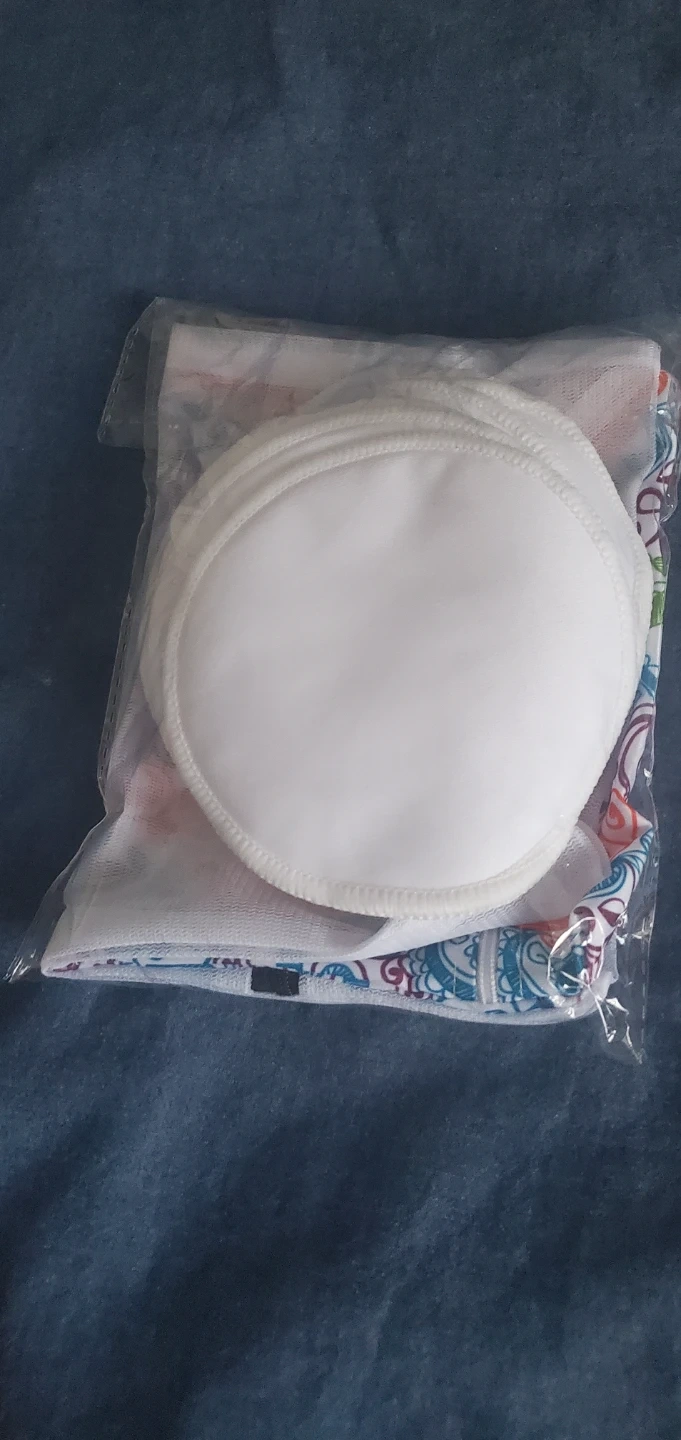 Set of five reusable nursing pads. Each pad is white and round. Includes a patterned laundry bag for washing. Material is a soft absorbent fabric.