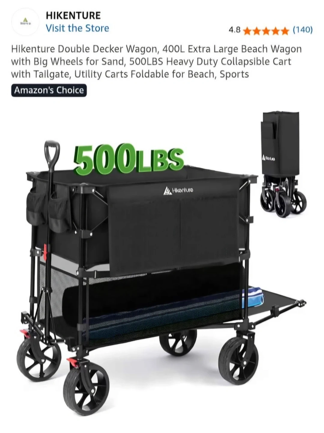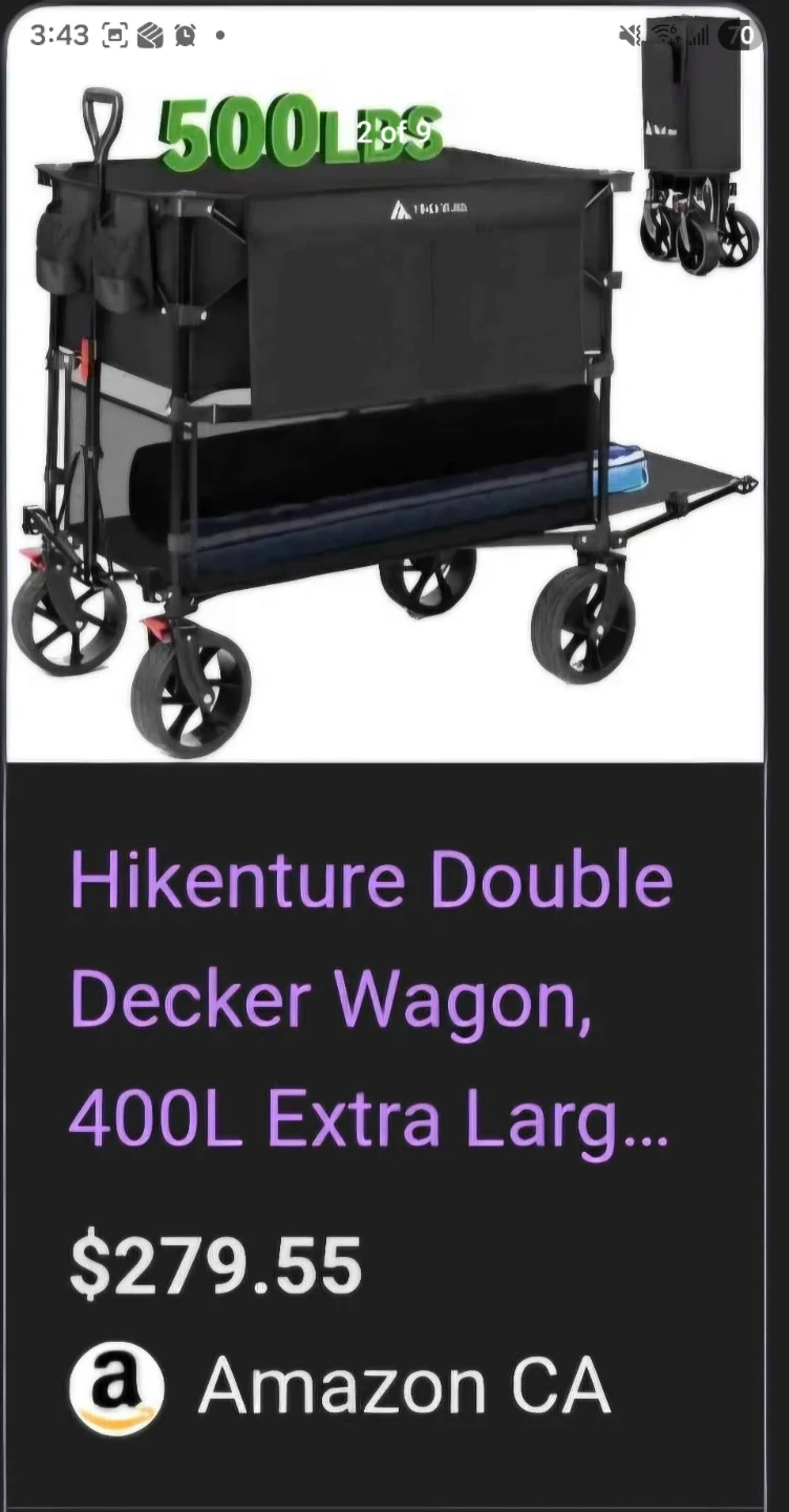 Buy & SellHikenature Double Decker WagonHikenature Double Decker Wagon$150This is a black, double-decker Hikenature wagon. It's collapsible and features large wheels for easy transport. It can hold up to 500lbs.ConditionNewWHERE TO MEETErin Mills town center areaView MapSELLERverifiedChrisCentral Erin Mills811 review1 chats·2 favorites·28 viewsSEND CHAT TO SELLERHi Chris! I’m interested in your listing.Hi Chris! I’m interested in your listing.Get the Karrot app to chatSign In to chat