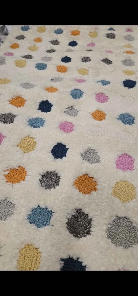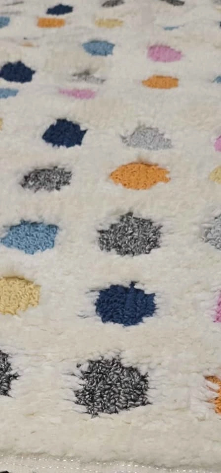 Features an all-over polka dot pattern with colorful accents on a neutral background. The machine-woven, long-pile construction provides a plush, soft texture underfoot. Includes fringe on the ends for a traditional design element. The jute backing helps the rug retain its shape and position in your room. Let me know if you're interested!