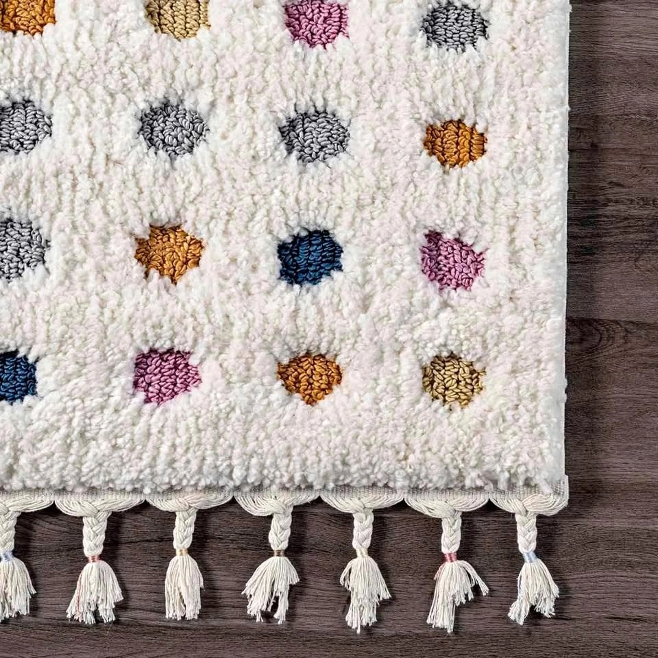 Features an all-over polka dot pattern with colorful accents on a neutral background. The machine-woven, long-pile construction provides a plush, soft texture underfoot. Includes fringe on the ends for a traditional design element. The jute backing helps the rug retain its shape and position in your room. Let me know if you're interested!