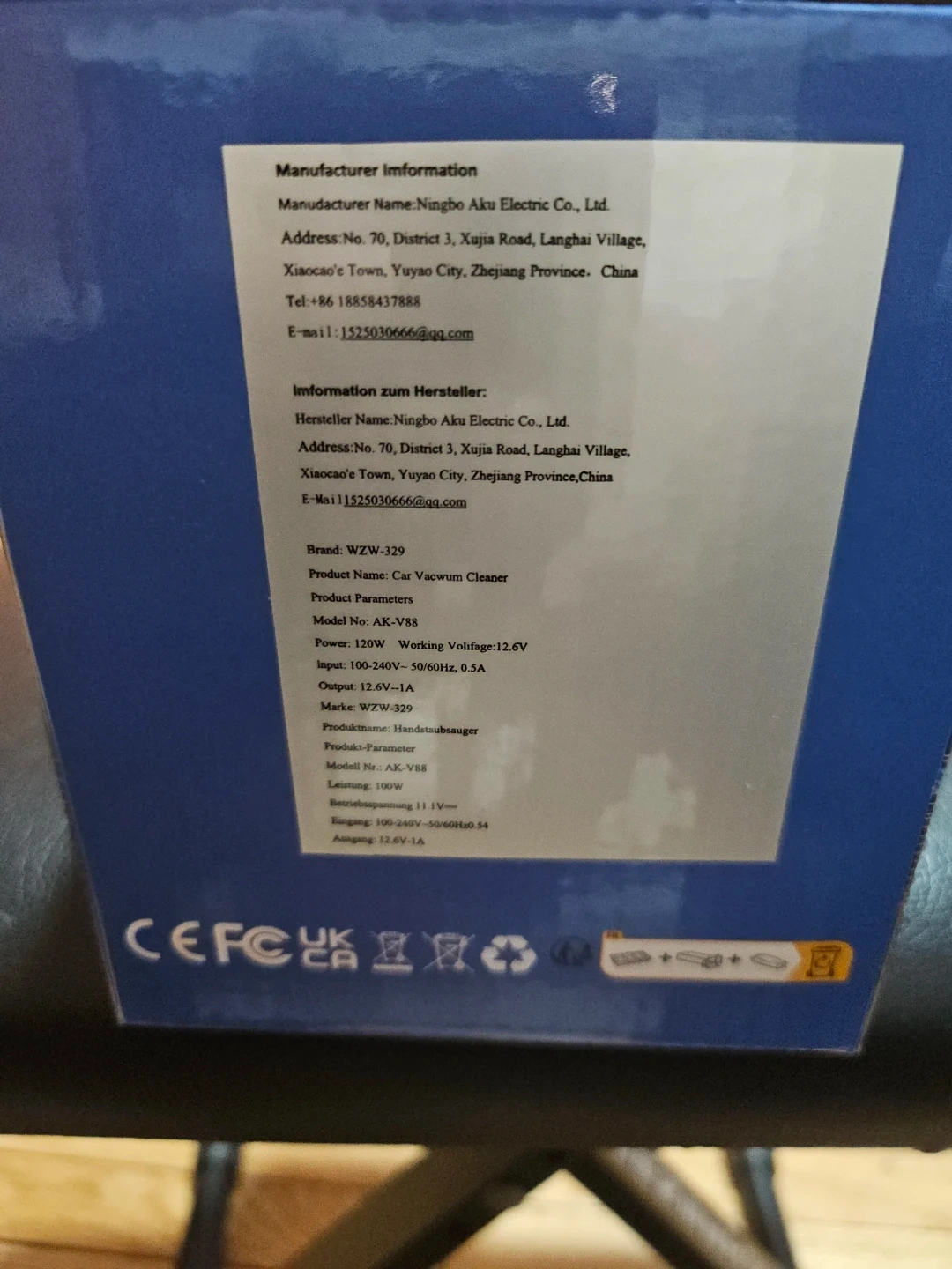 Portable car vacuum cleaner. 100W working voltage 12.6V. Output 12V, 1A. Includes original box.
