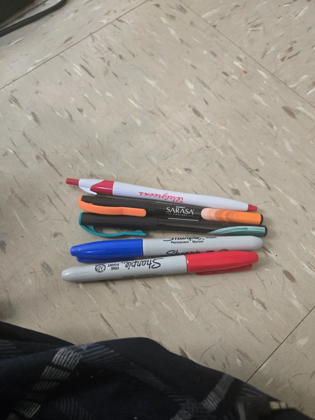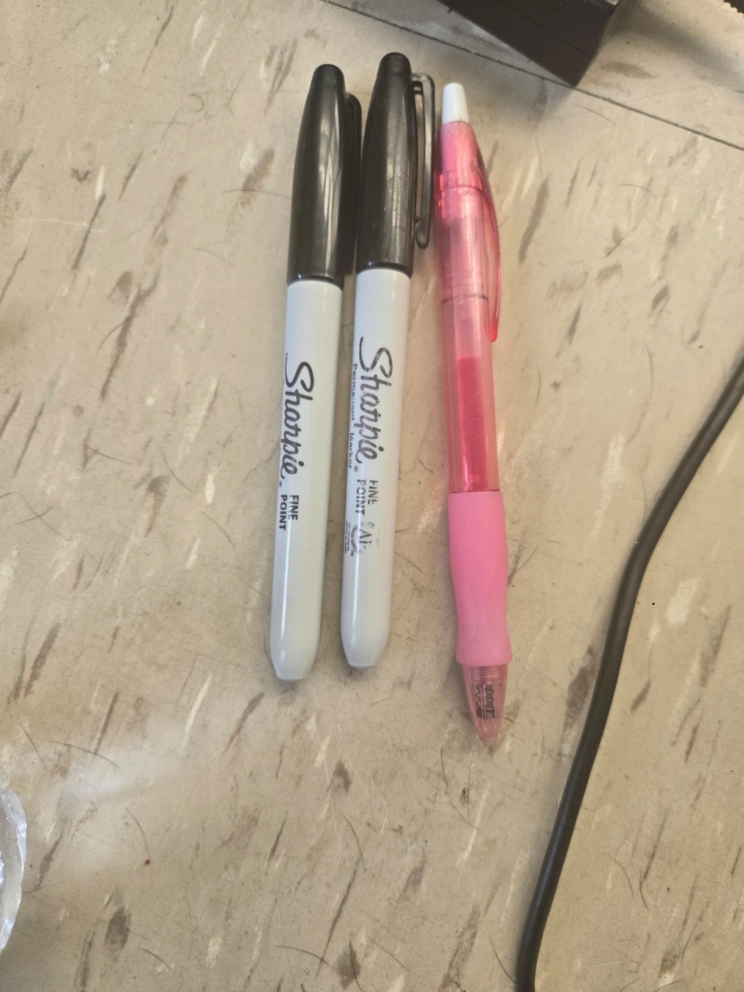 This lot includes two Sharpie Fine Point markers and one pink pen. Also included are two additional Sharpie markers, a Walgreens brand pen, and a black and orange pen. They're all ready for your writing and drawing needs!
