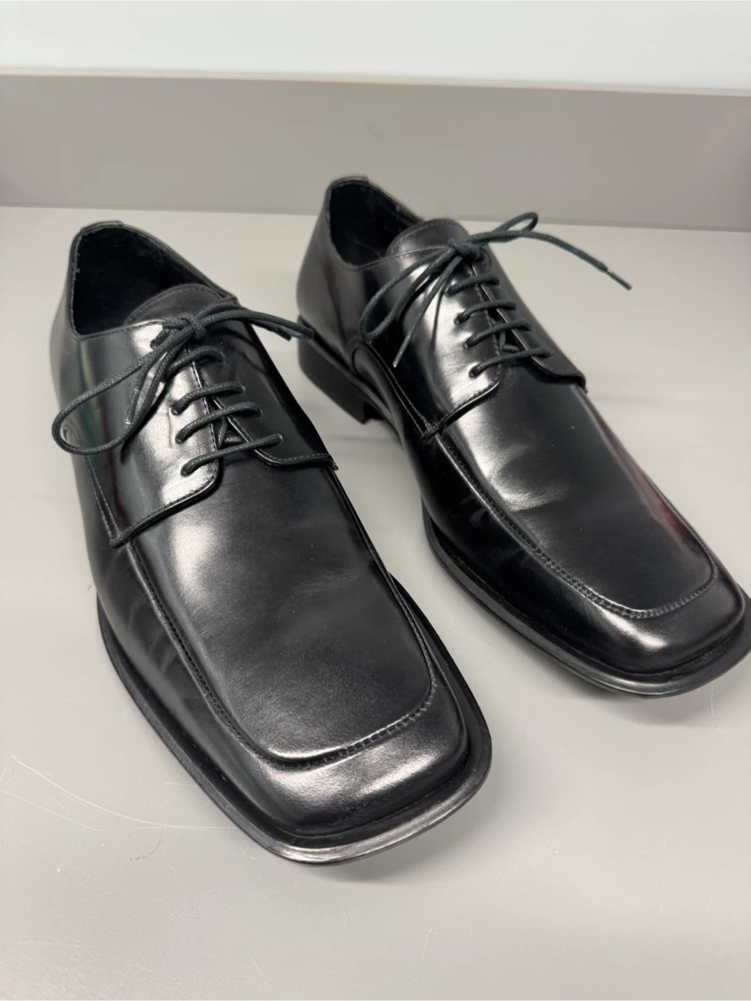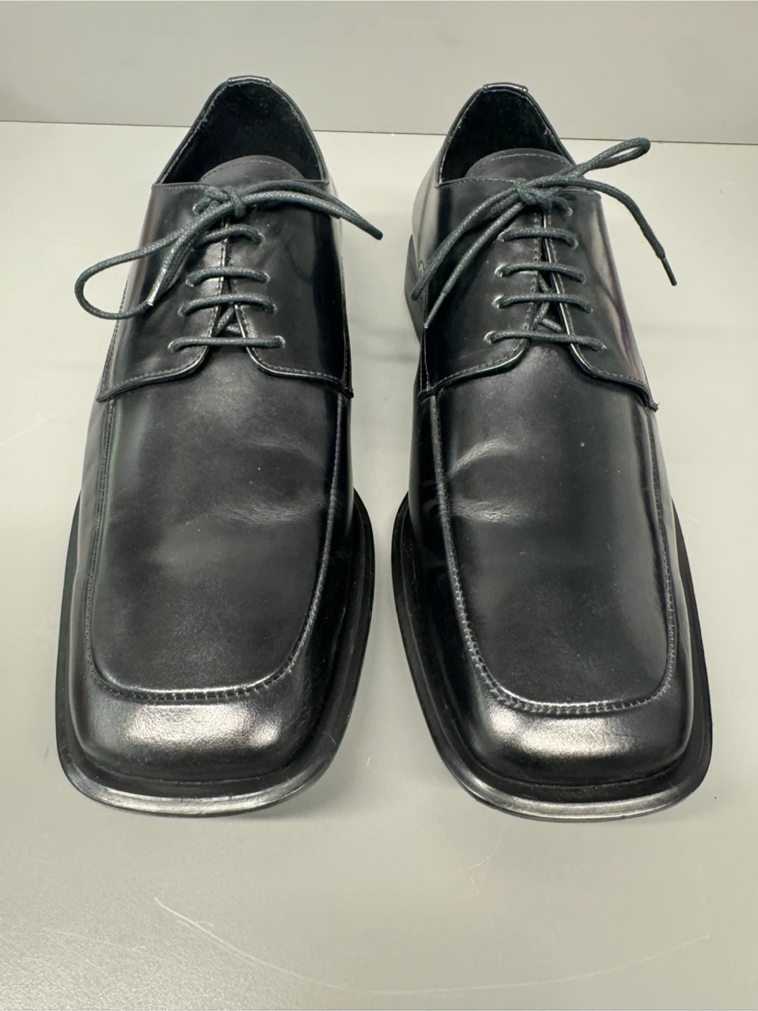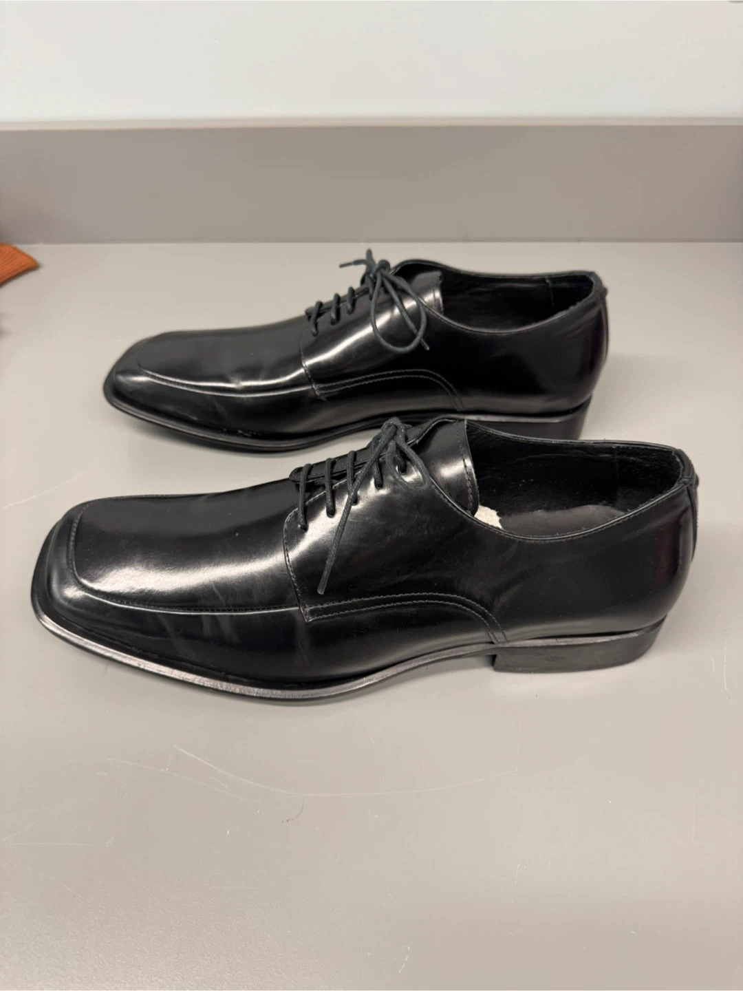 Classic black dress shoes with a square toe design. These lace-up shoes offer a sleek look for formal occasions. Made with a shiny synthetic material.