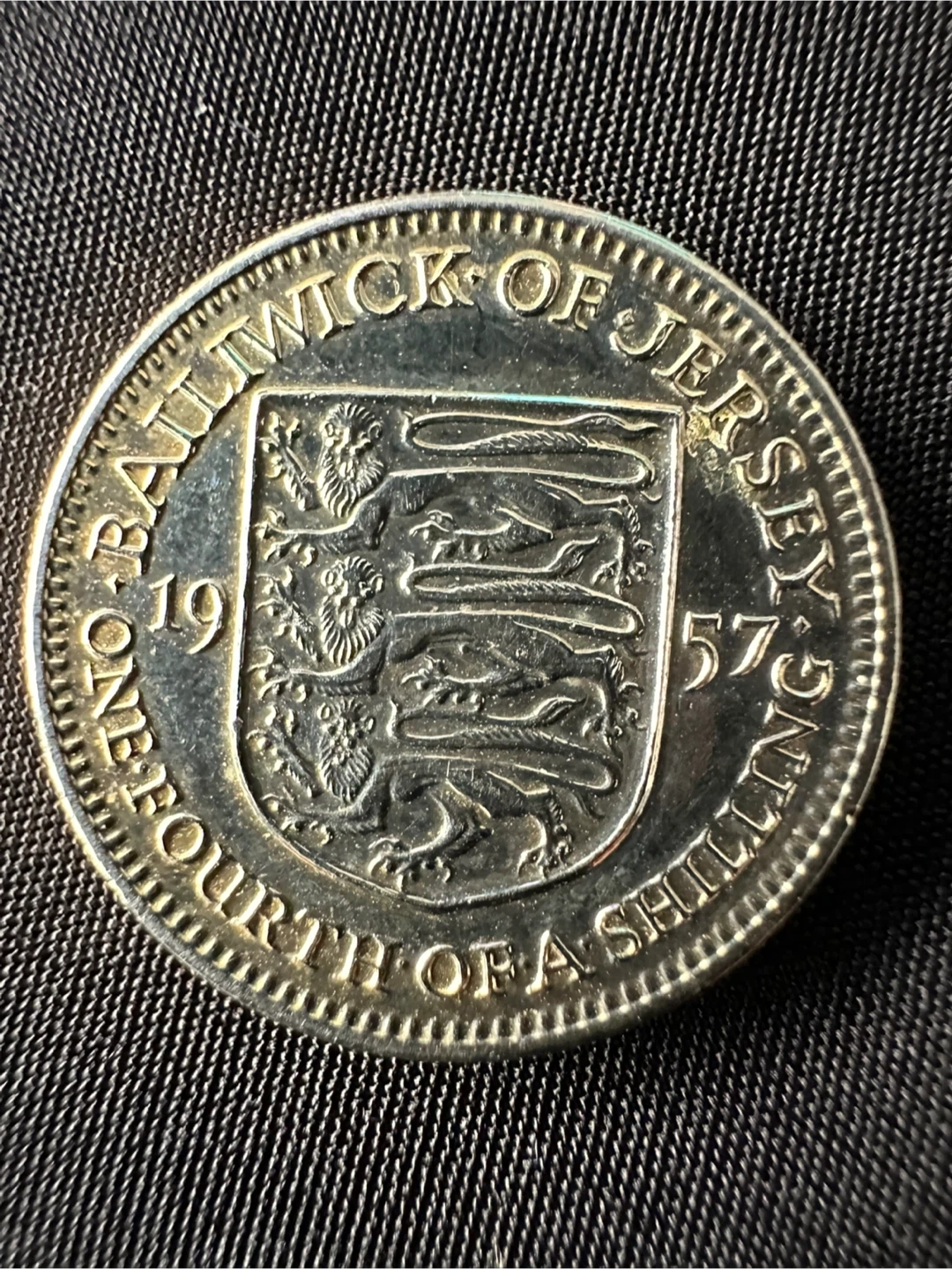 A 1957 coin from Jersey, denomination one fourth of a shilling. It features Queen Elizabeth II on one side and the Arms of Jersey on the other. This coin is a nice piece for collectors.