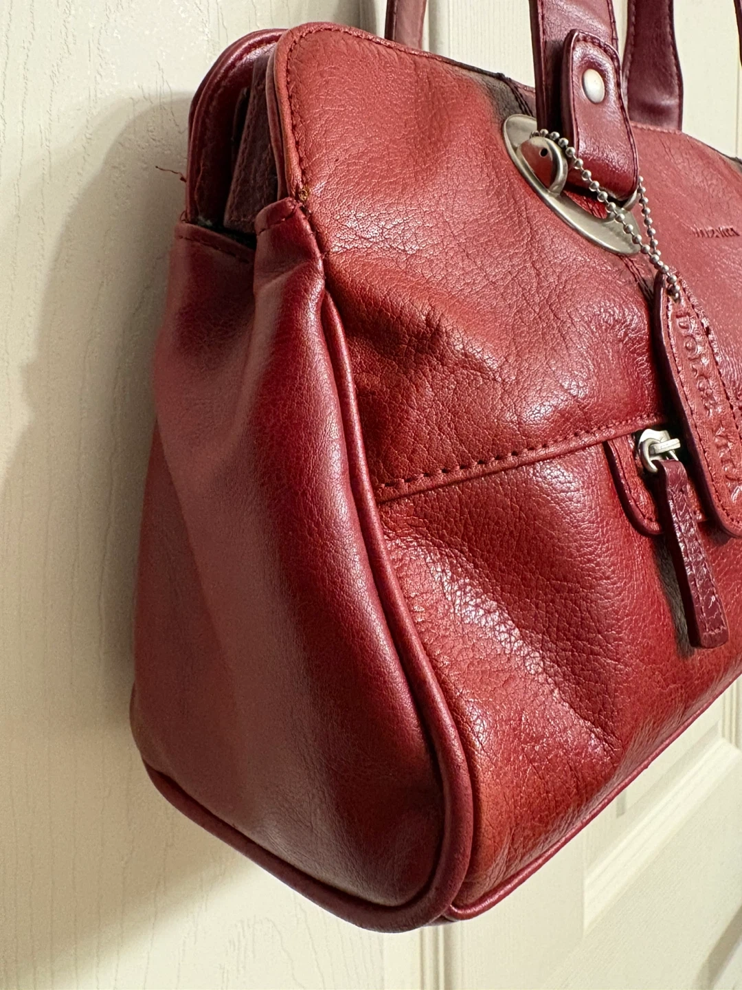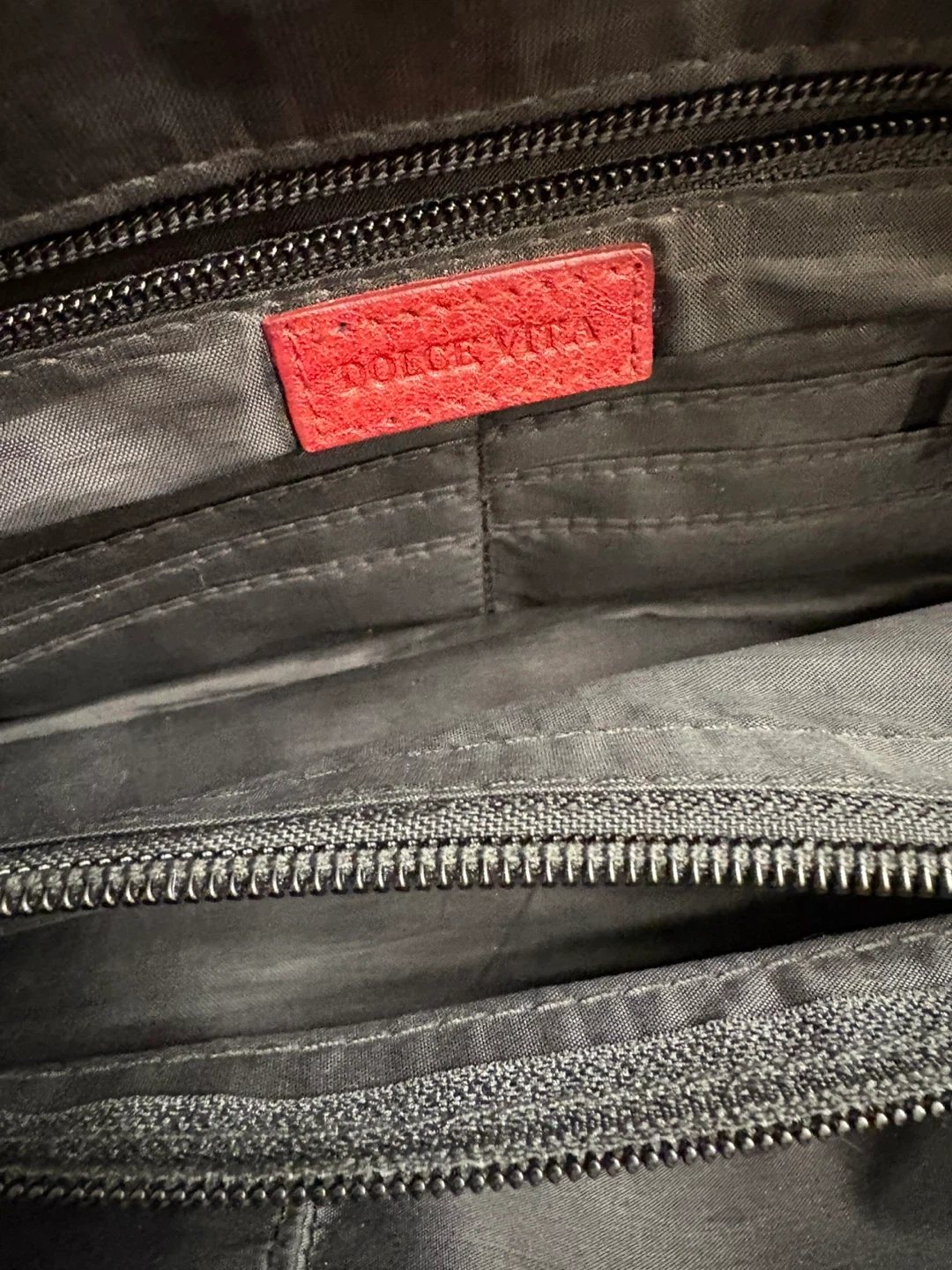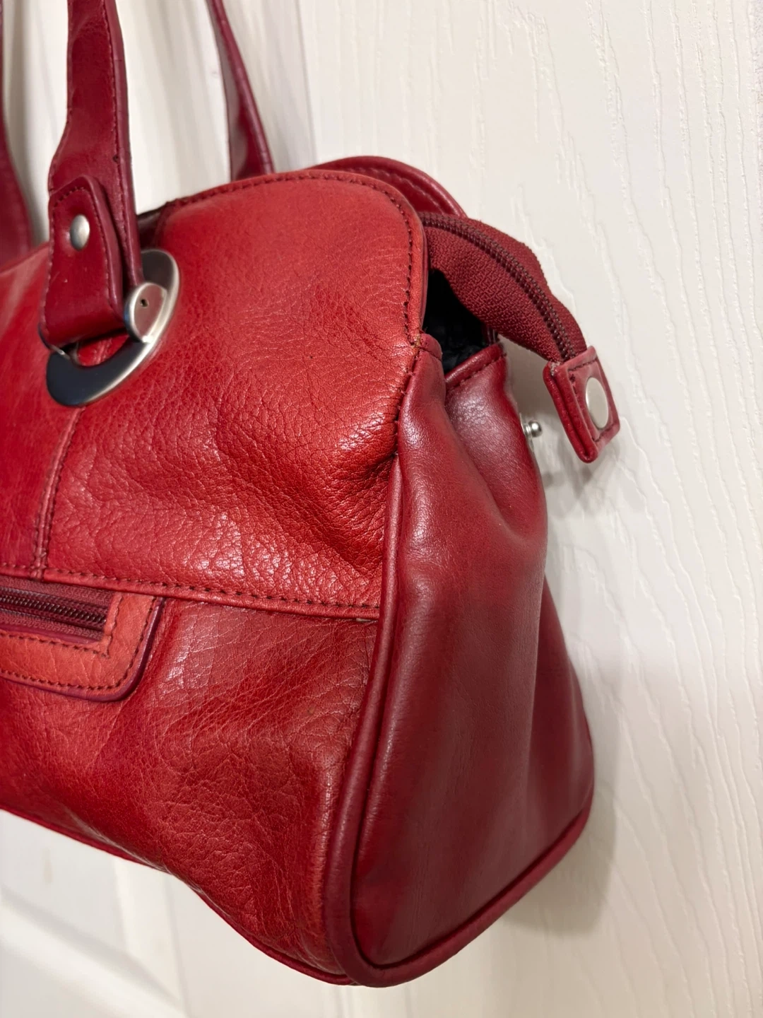 This is a red leather handbag from Dolce Vita. It has a zippered main compartment and an exterior zippered pocket. The straps are a comfortable length for carrying, as a shoulder bag. Perfect condition, just like new! Pick up in Chestermere.