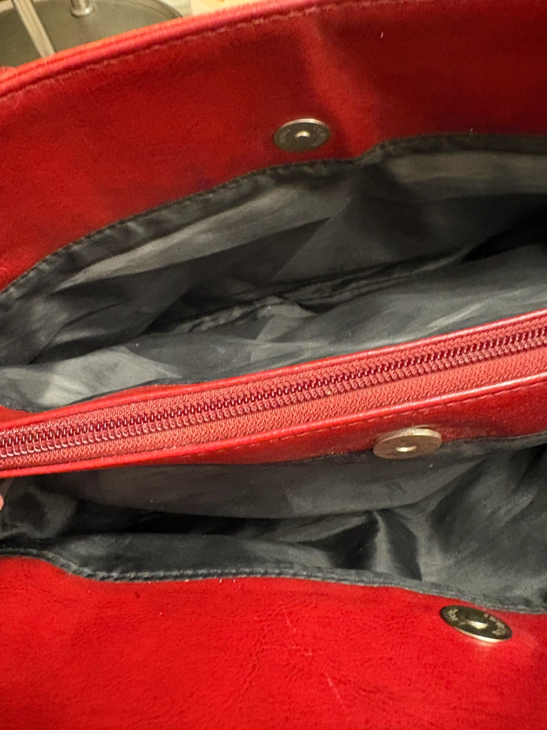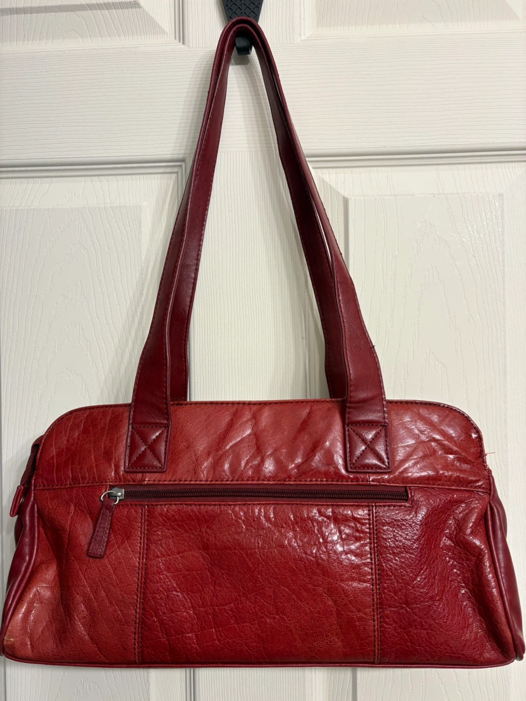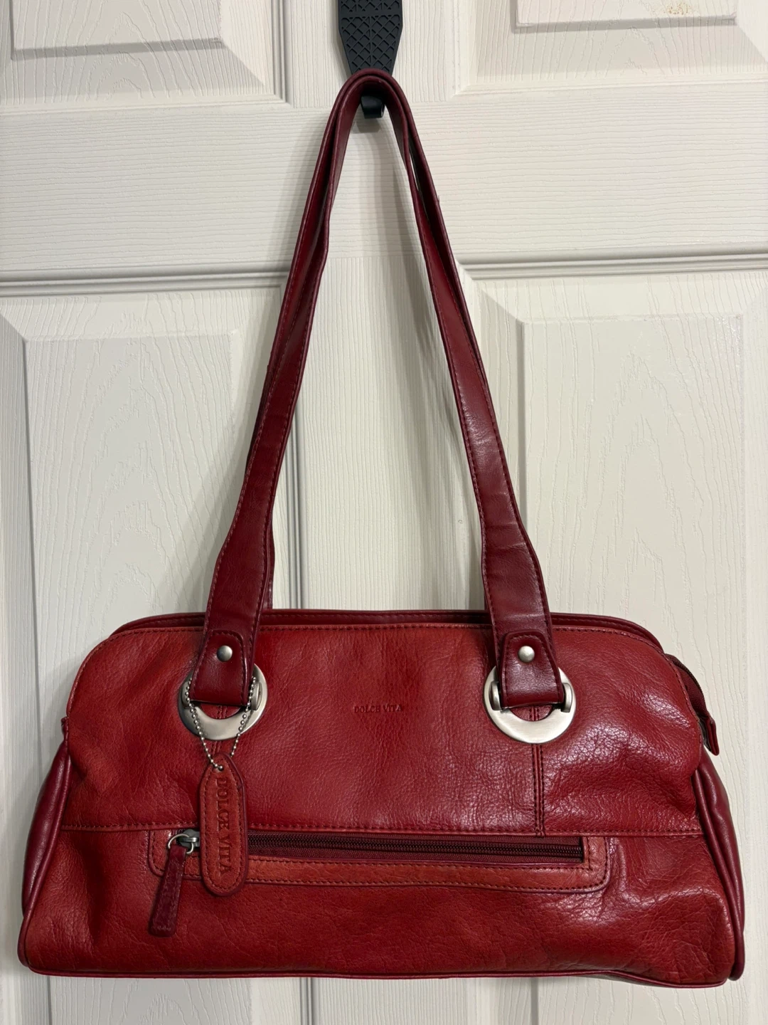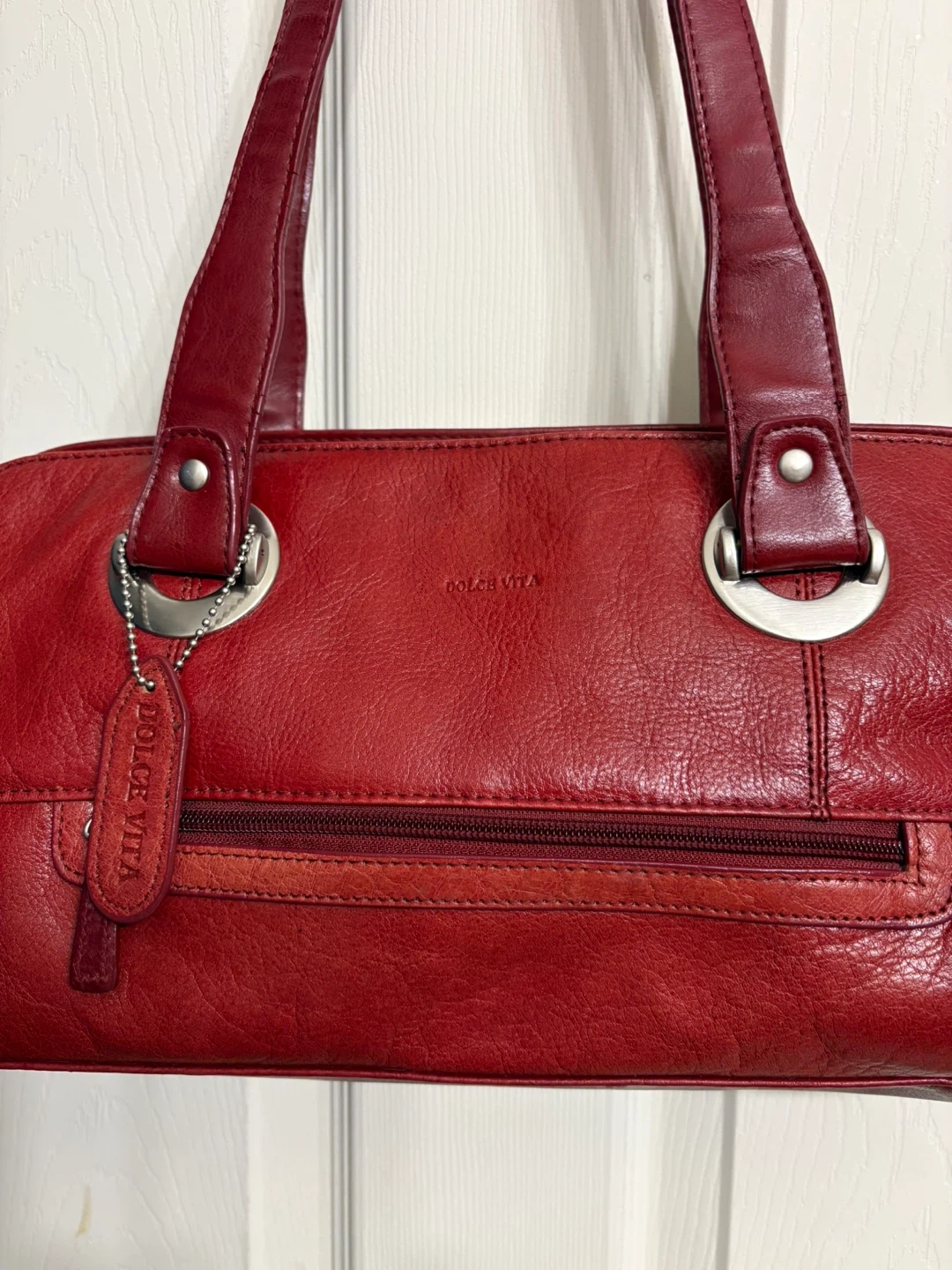 This is a red leather handbag from Dolce Vita. It has a zippered main compartment and an exterior zippered pocket. The straps are a comfortable length for carrying, as a shoulder bag. Perfect condition, just like new! Pick up in Chestermere.