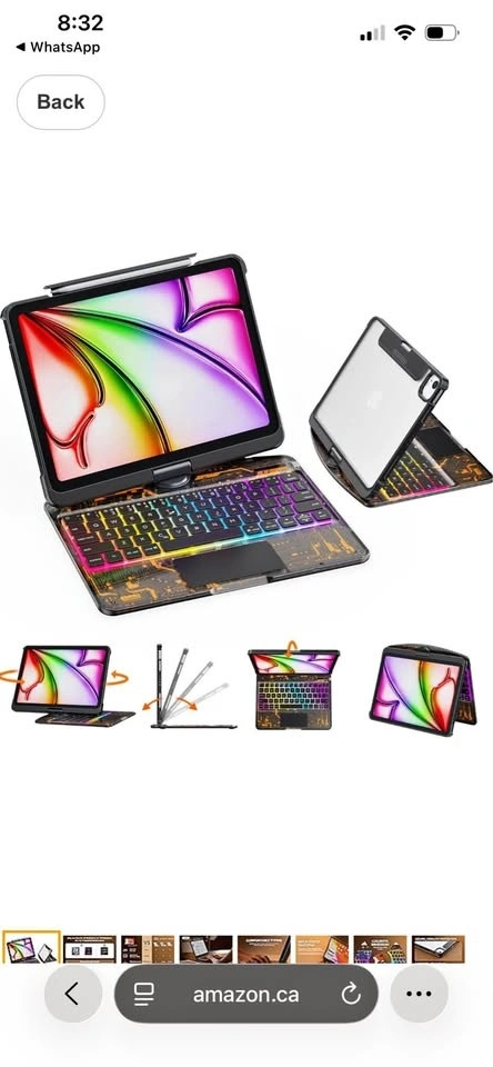 Transparent case with wireless keyboard for iPad Air 13-inch (M3/M2, 2025/2024). Features 7-color backlight, trackpad, and a 360° rotating stand. Also compatible with iPad Pro 12.9-inch (6th/5th/4th/3rd Gen). Tech Style.