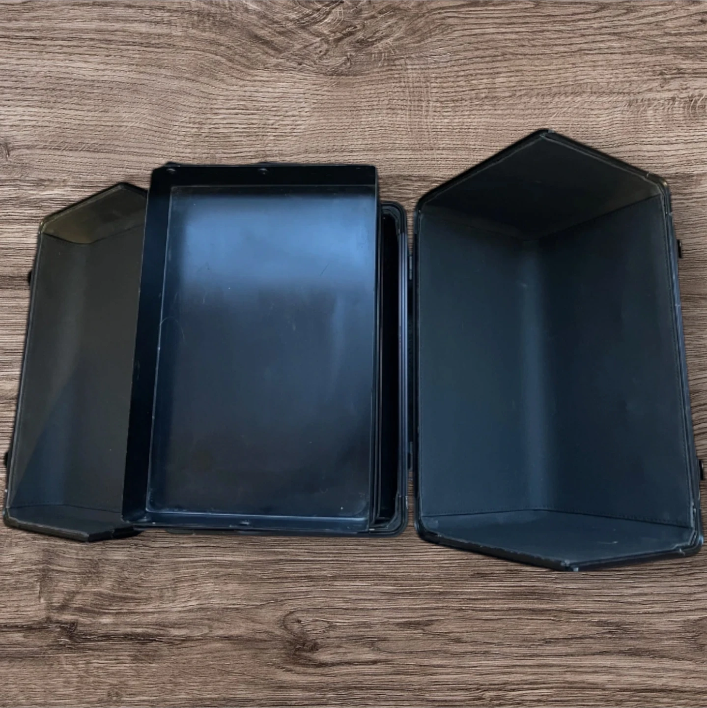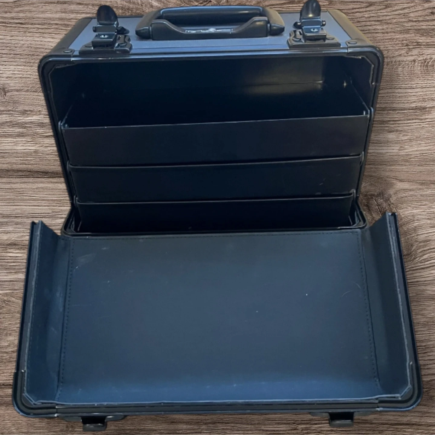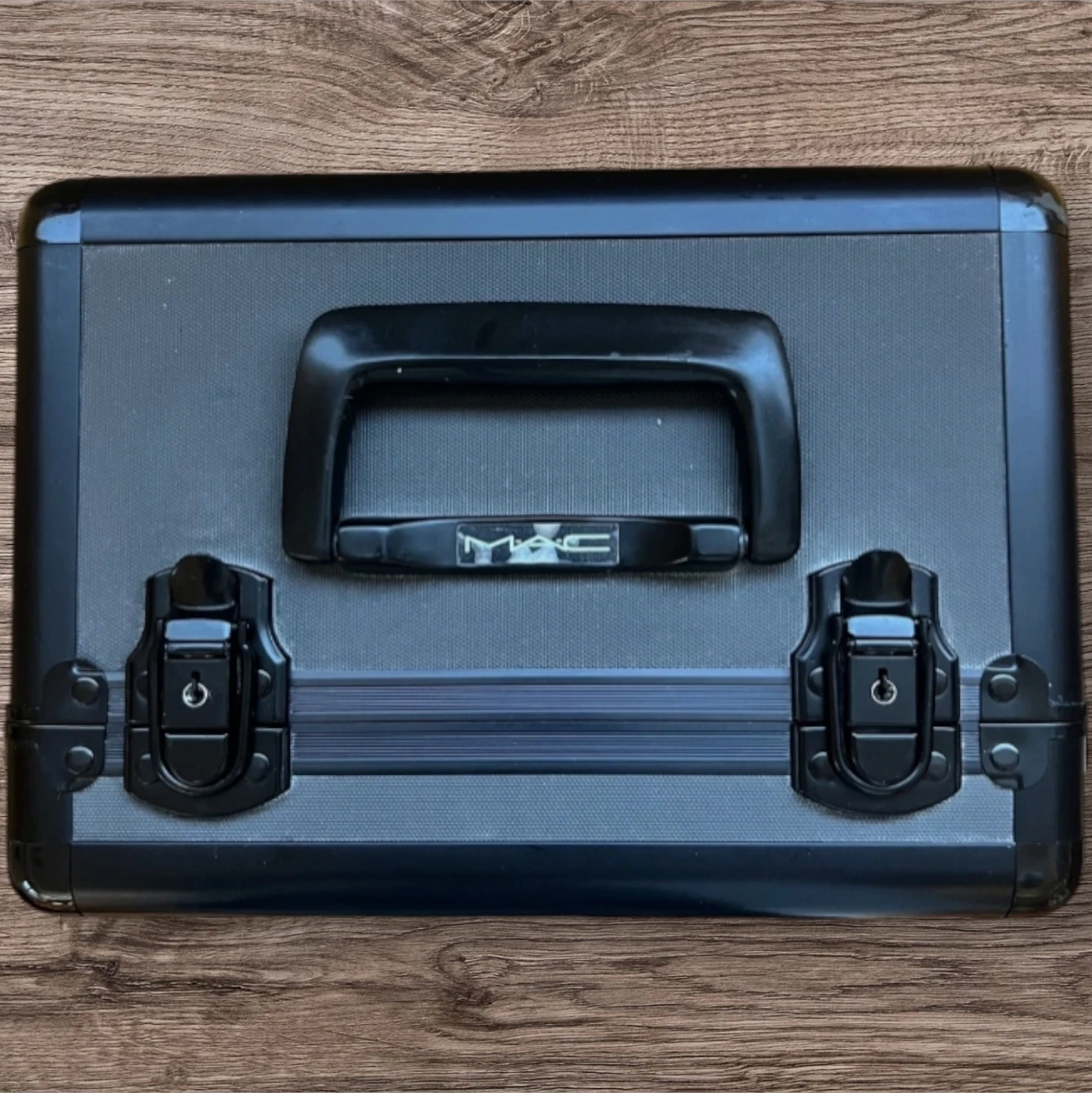 This is a brand new, never used vintage murdered out monochrome black and dark grey MAC train case which contains three (3) cantilevered metal trays for organization.
