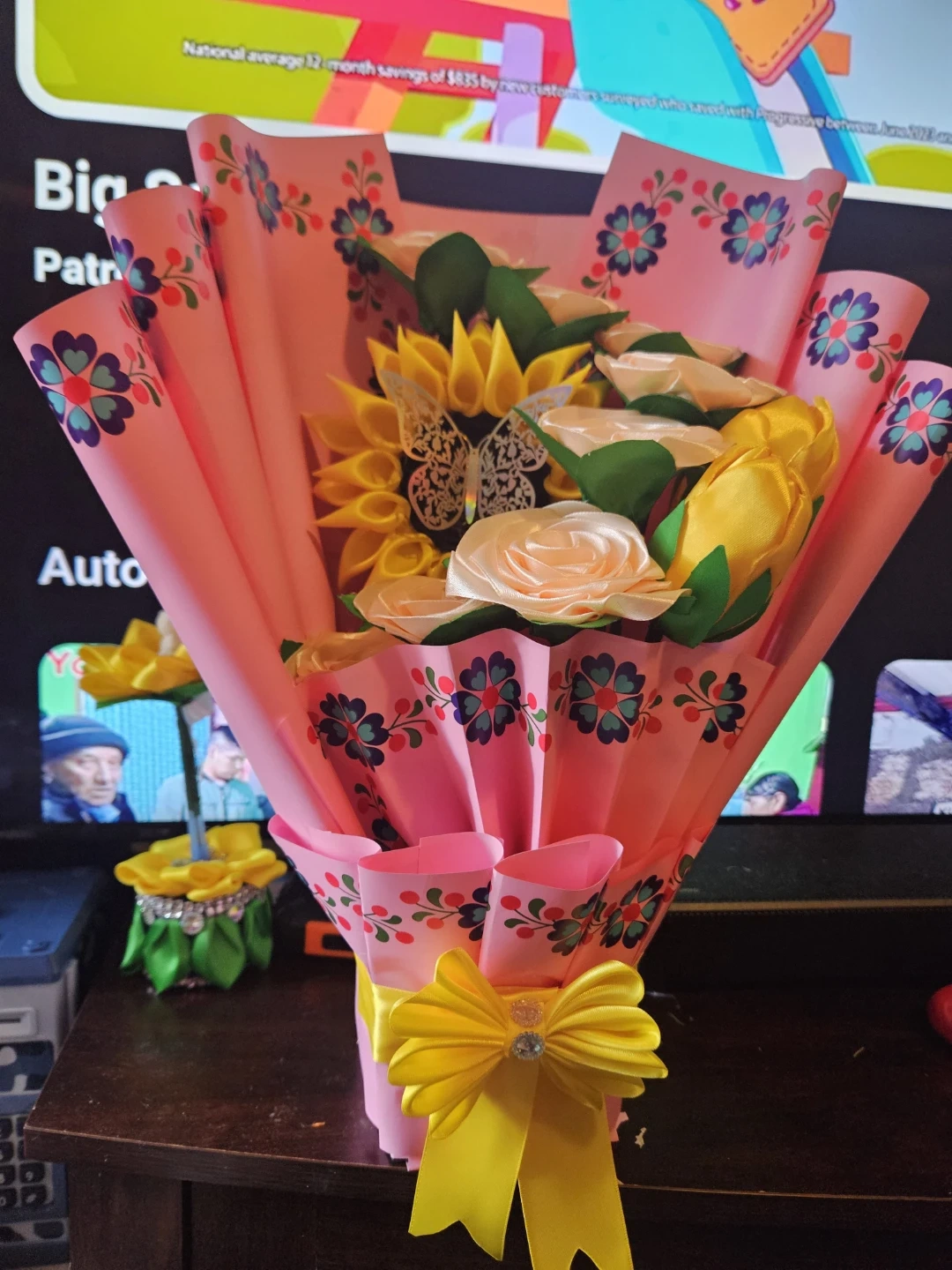 This adorable handmade crochet set includes a baby dress, a matching hat, and a headband. It features a soft pink and white striped design with delicate yellow flower accents. The dress has a white ruffled skirt adorned with yellow flowers and a yellow lace trim. Perfect for a baby shower gift or special occasion!