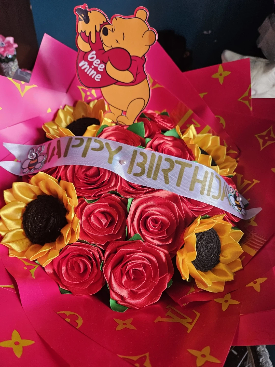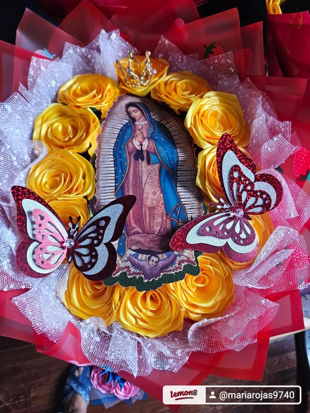 This adorable handmade crochet set includes a baby dress, a matching hat, and a headband. It features a soft pink and white striped design with delicate yellow flower accents. The dress has a white ruffled skirt adorned with yellow flowers and a yellow lace trim. Perfect for a baby shower gift or special occasion!