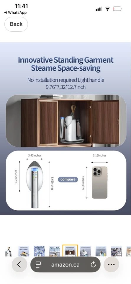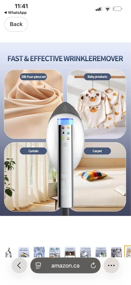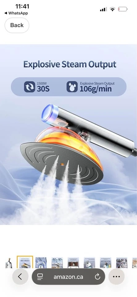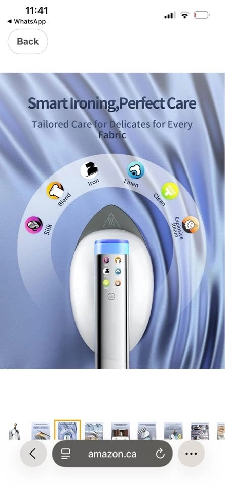 This is a 1500W professional garment steamer, great for tackling wrinkles. It features a 2-in-1 vertical and handheld design, 6 steam modes, and heats up in just 30 seconds. The tank holds 800mL and it has an auto shut-off feature for safety. It's portable and has a standing design. White color.
