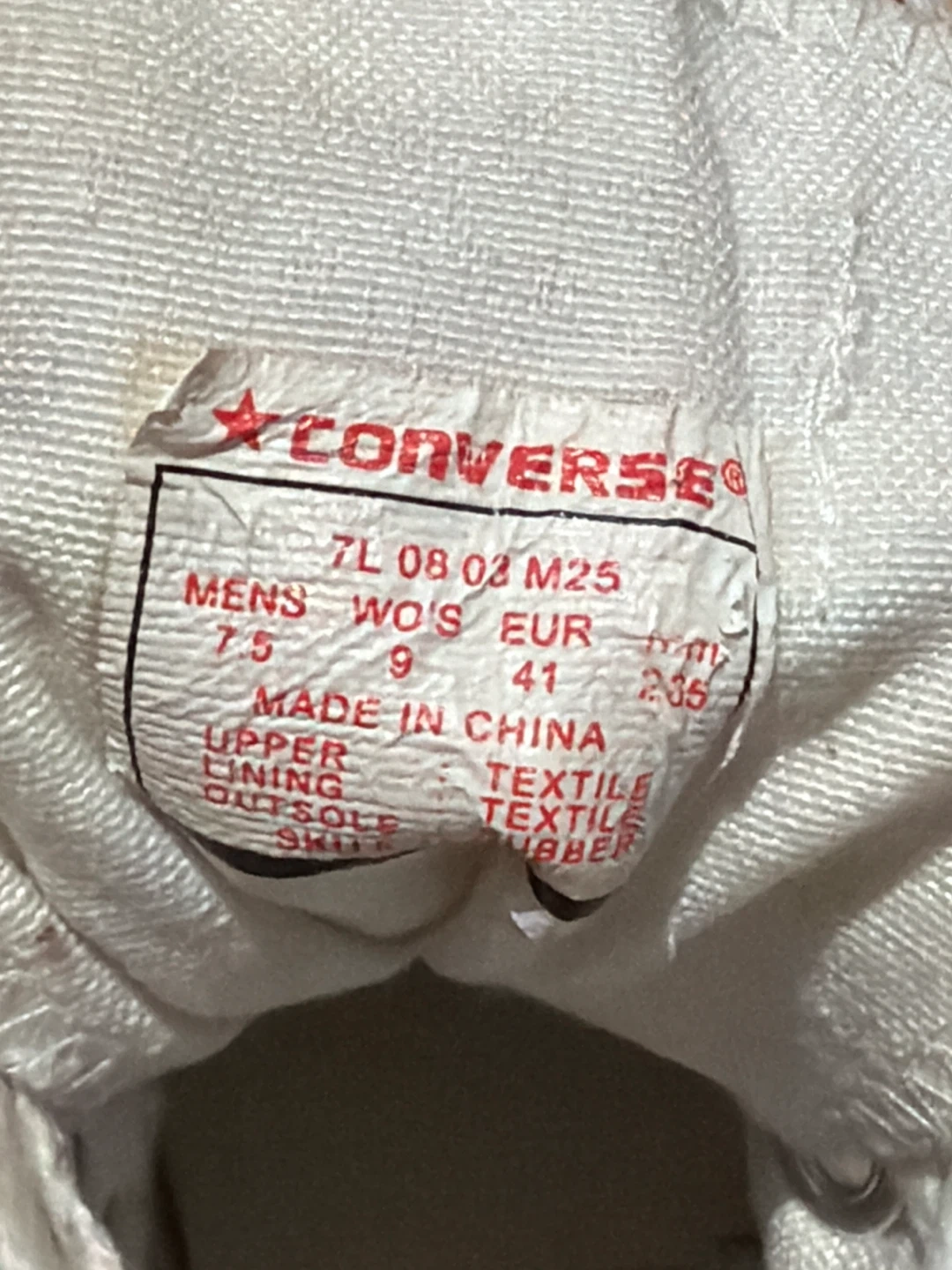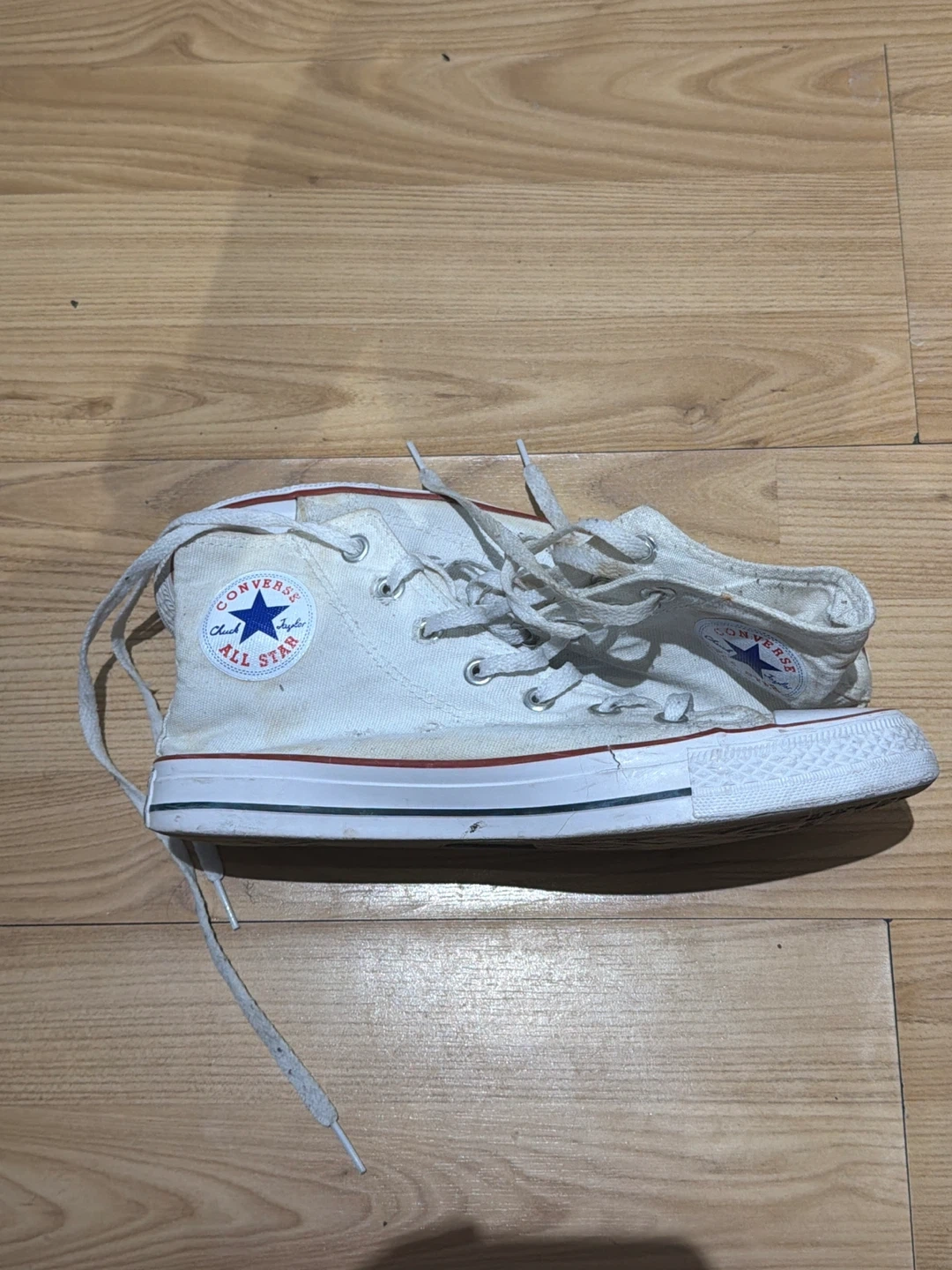 White canvas Converse Chuck Taylor All Star high top sneakers. Women's size 9, men's size 7.5. Textile upper with rubber sole. Some signs of wear present. These are classic high-tops for everyday wear.