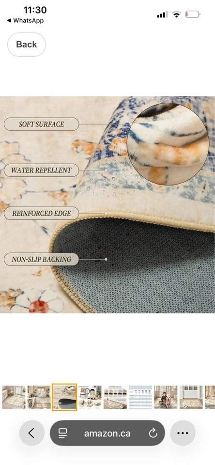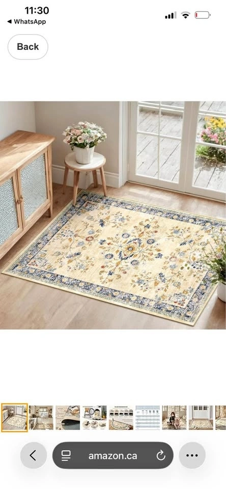 Vintage floral distress print pattern area rug. Measures 3x5 feet. Washable, non-slip, low-pile indoor carpet. Suitable for bedroom, living room, dining room, and entryway. Features beige, navy blue, and orange colors.