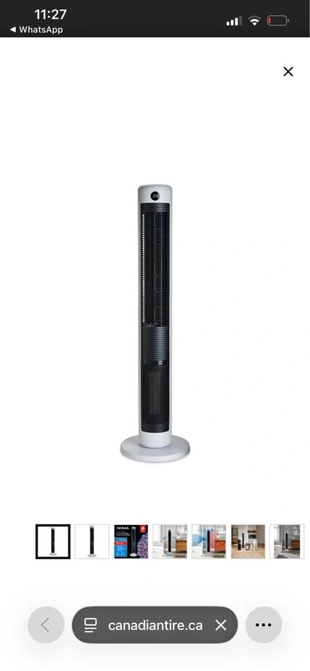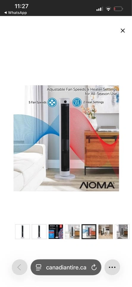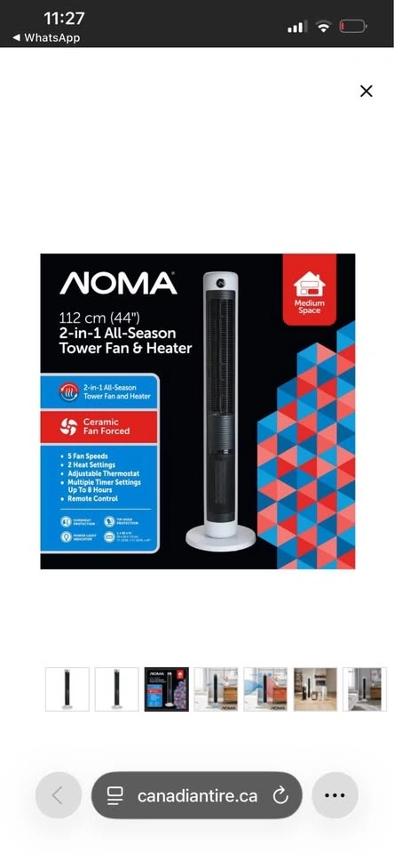 This NOMA 2-in-1 Tower Fan & Heater is 44 inches tall and offers both cooling and heating functions. It's a versatile appliance for year-round comfort.