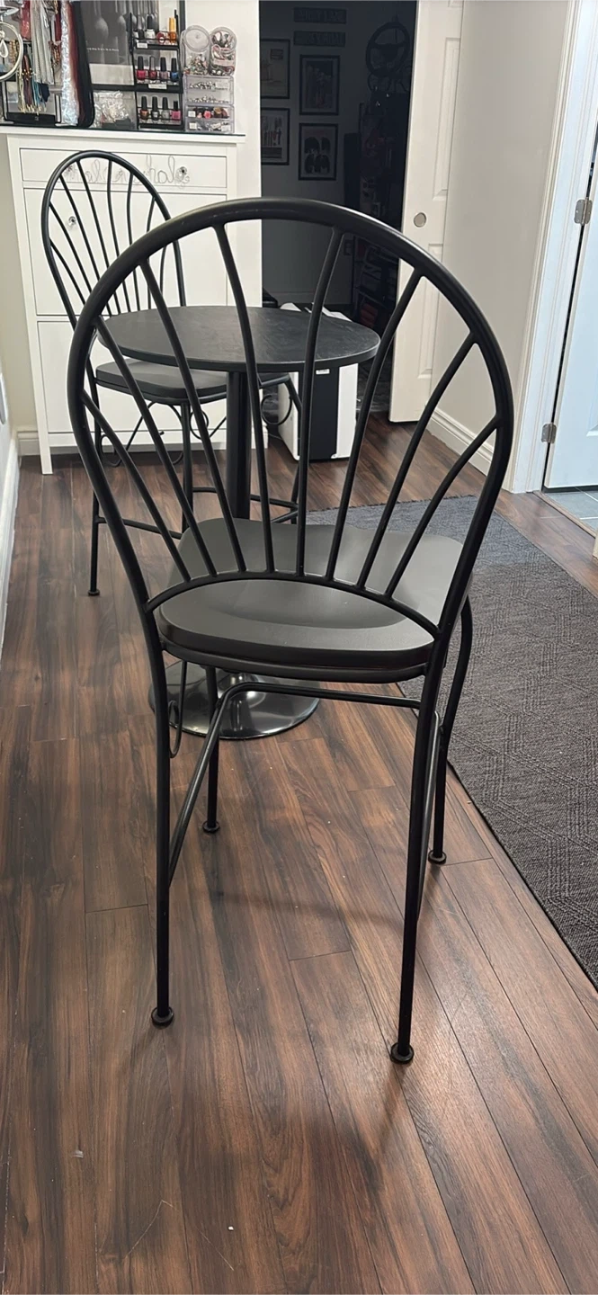 Selling a set of two black metal bar stools with black seats. These stools feature a decorative fan-shaped backrest and a footrest. They're great for a kitchen island or home bar. The seat material is a matte black, and the frame is wrought iron style metal.Seat is wood