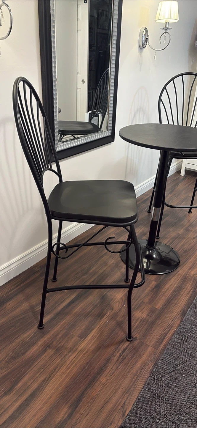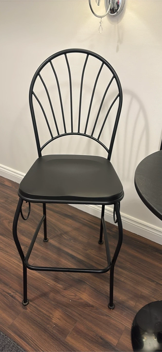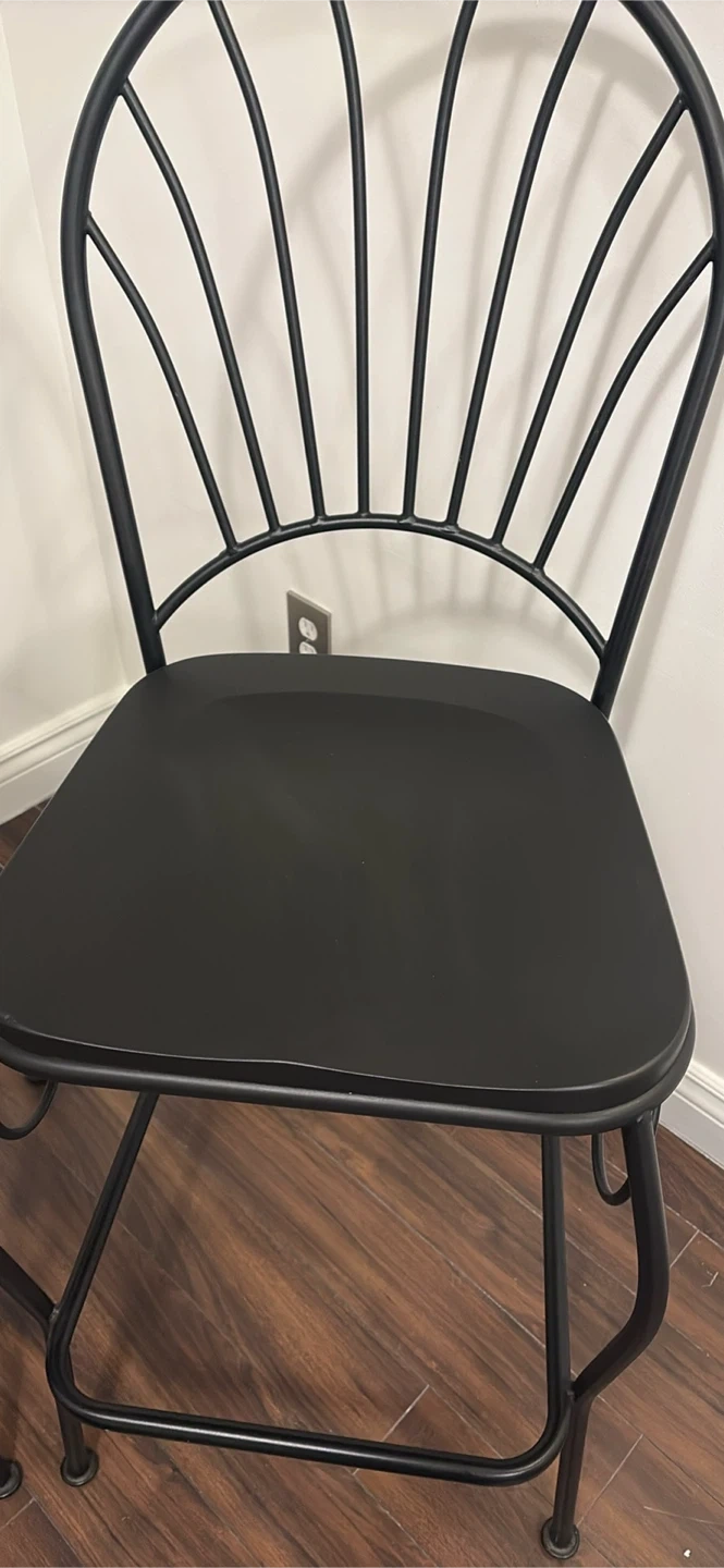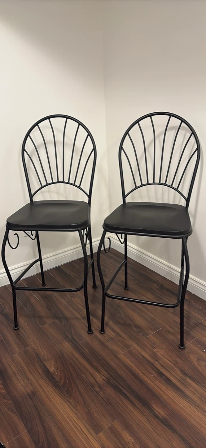 Selling a set of two black metal bar stools with black seats. These stools feature a decorative fan-shaped backrest and a footrest. They're great for a kitchen island or home bar. The seat material is a matte black, and the frame is wrought iron style metal.Seat is wood