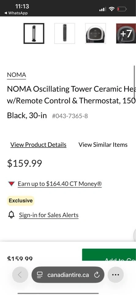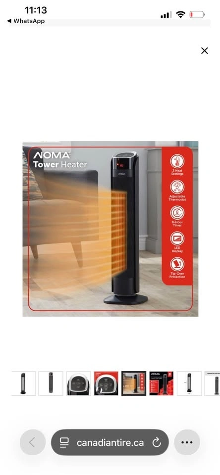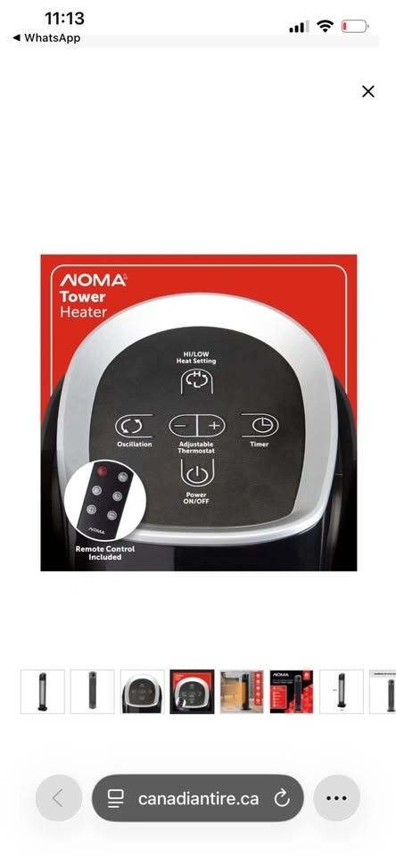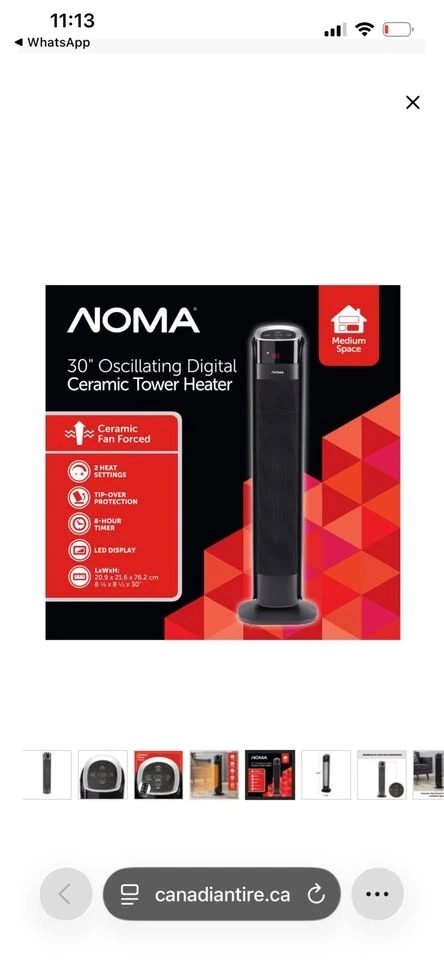 This NOMA oscillating tower ceramic heater is 30 inches tall and comes in black. It features a remote control and thermostat, with a powerful 1500W heating capacity. Feel free to message if you have any questions!