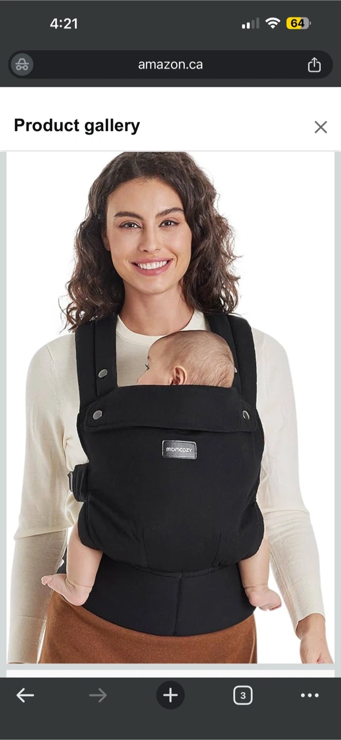 This is a black baby carrier from Momcozy. It's designed for comfortable babywearing. The carrier is black and made of fabric.