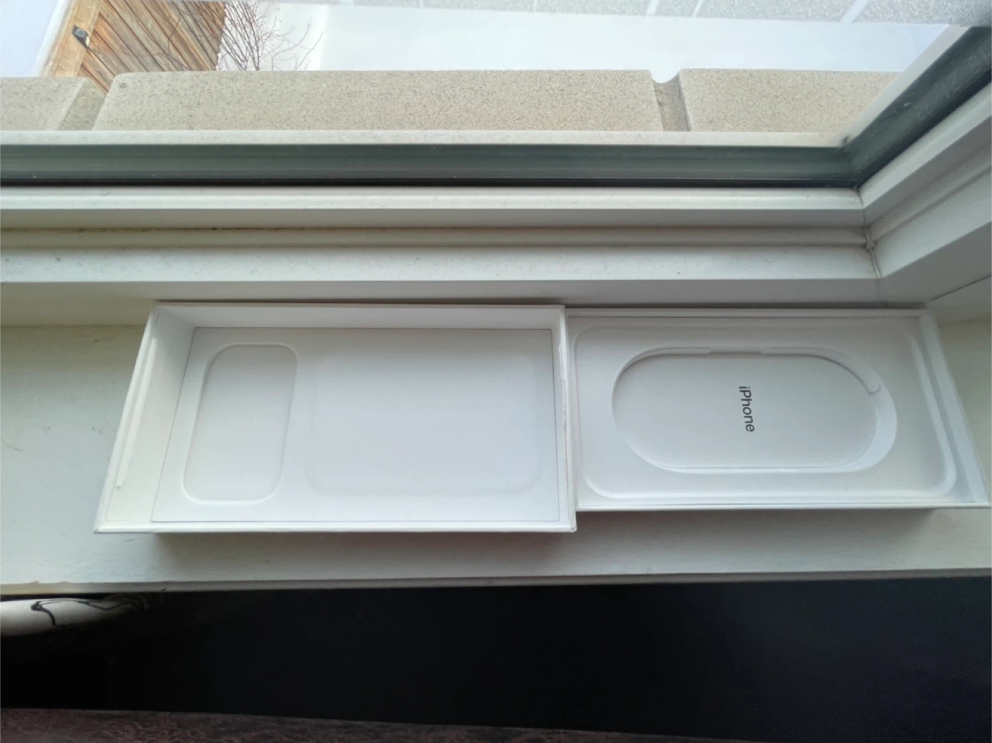 box. It's orange and comes with the original inner tray. The "iPhone" logo is printed on the side.