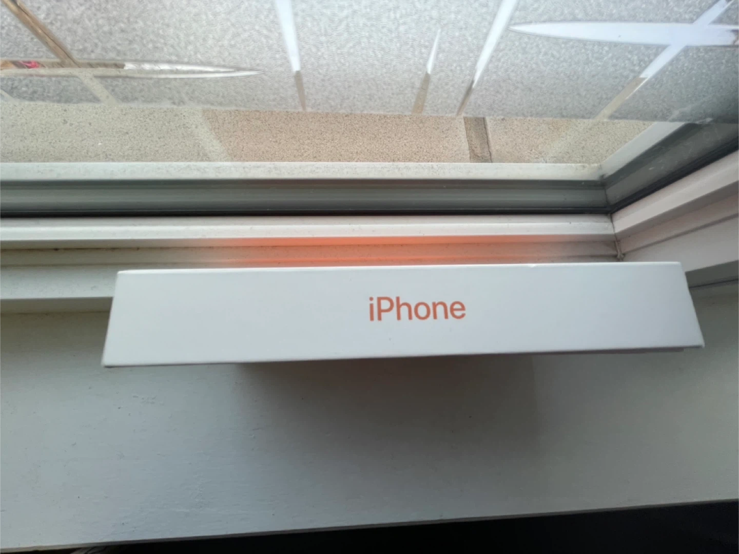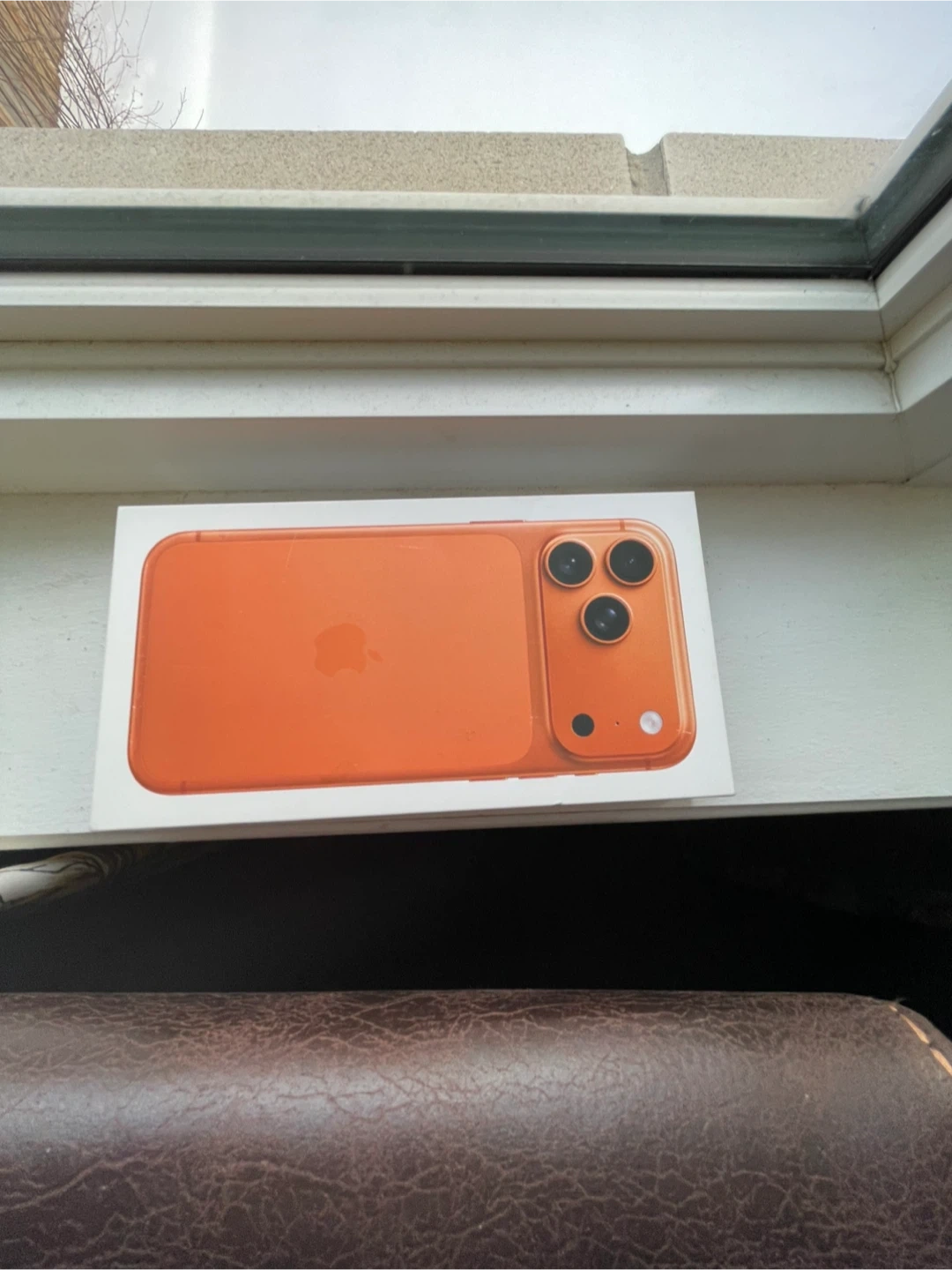 box. It's orange and comes with the original inner tray. The "iPhone" logo is printed on the side.