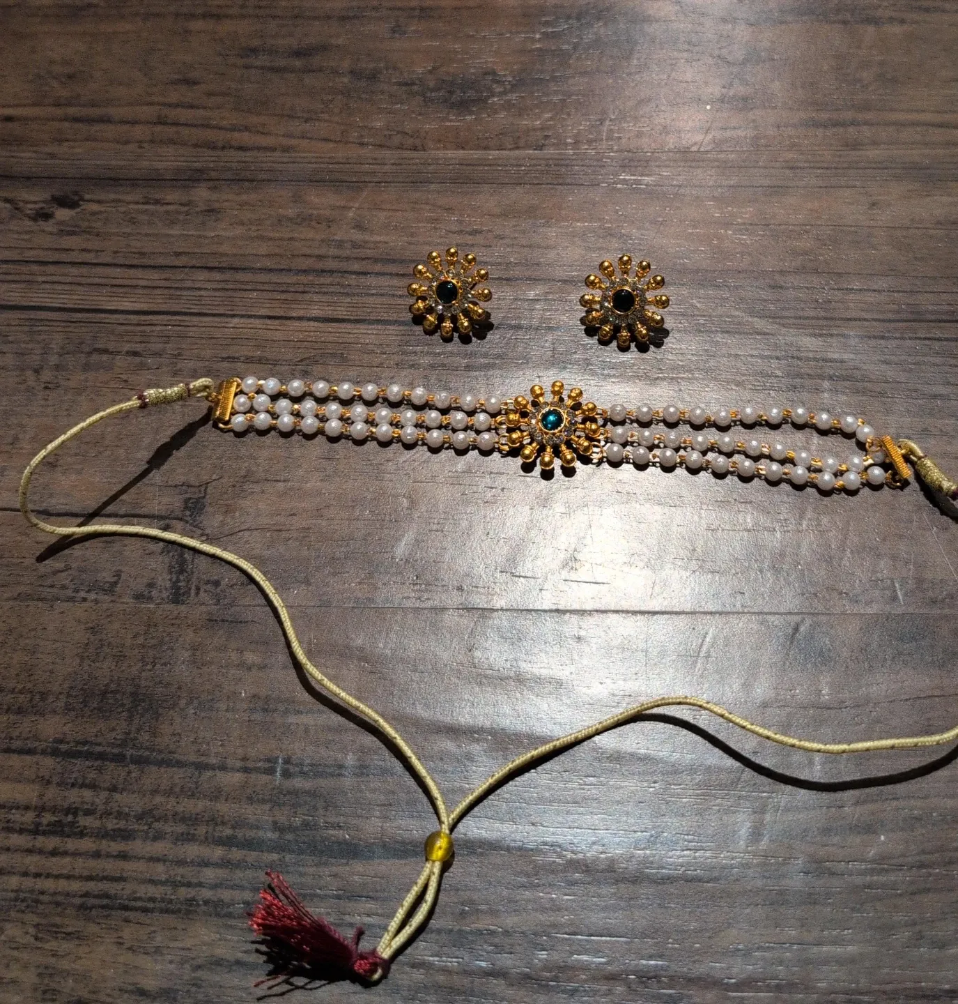 This set includes a pearl choker necklace and matching stud earrings. The necklace features multiple strands of small white pearls and a central gold-toned floral design with a blue gem. The earrings also have a floral design with a blue gem. Both pieces have adjustable gold cords for closure.