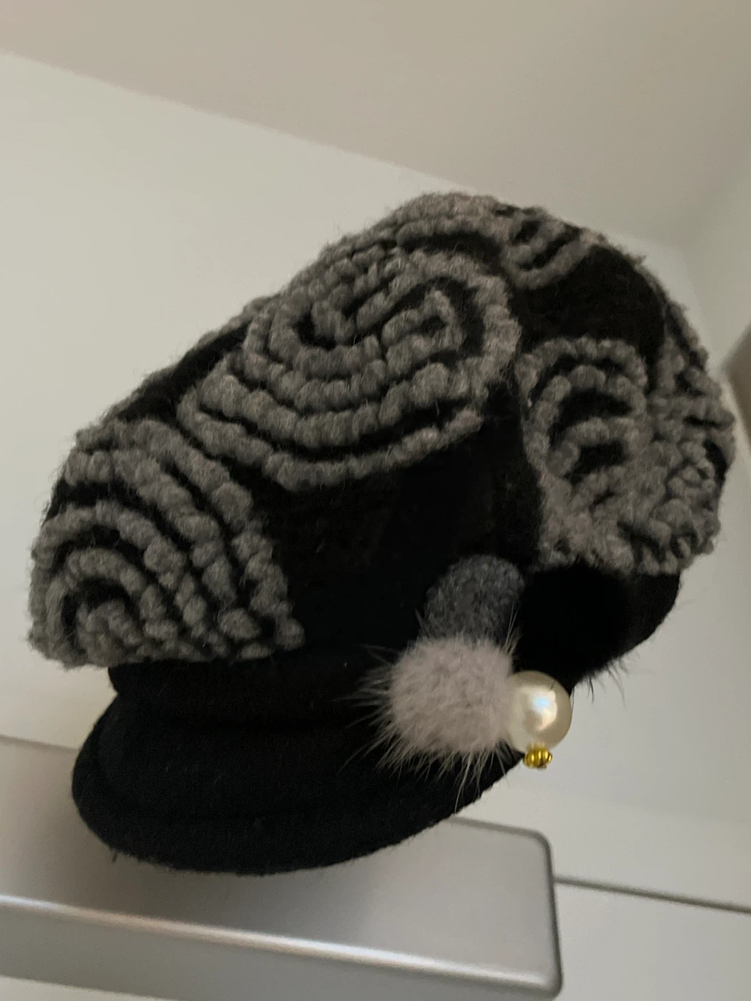 This beret features a textured grey swirl pattern on a black base. It's adorned with a fluffy grey pom-pom and a faux pearl detail with a gold bead. It's a stylish accessory for cooler weather.