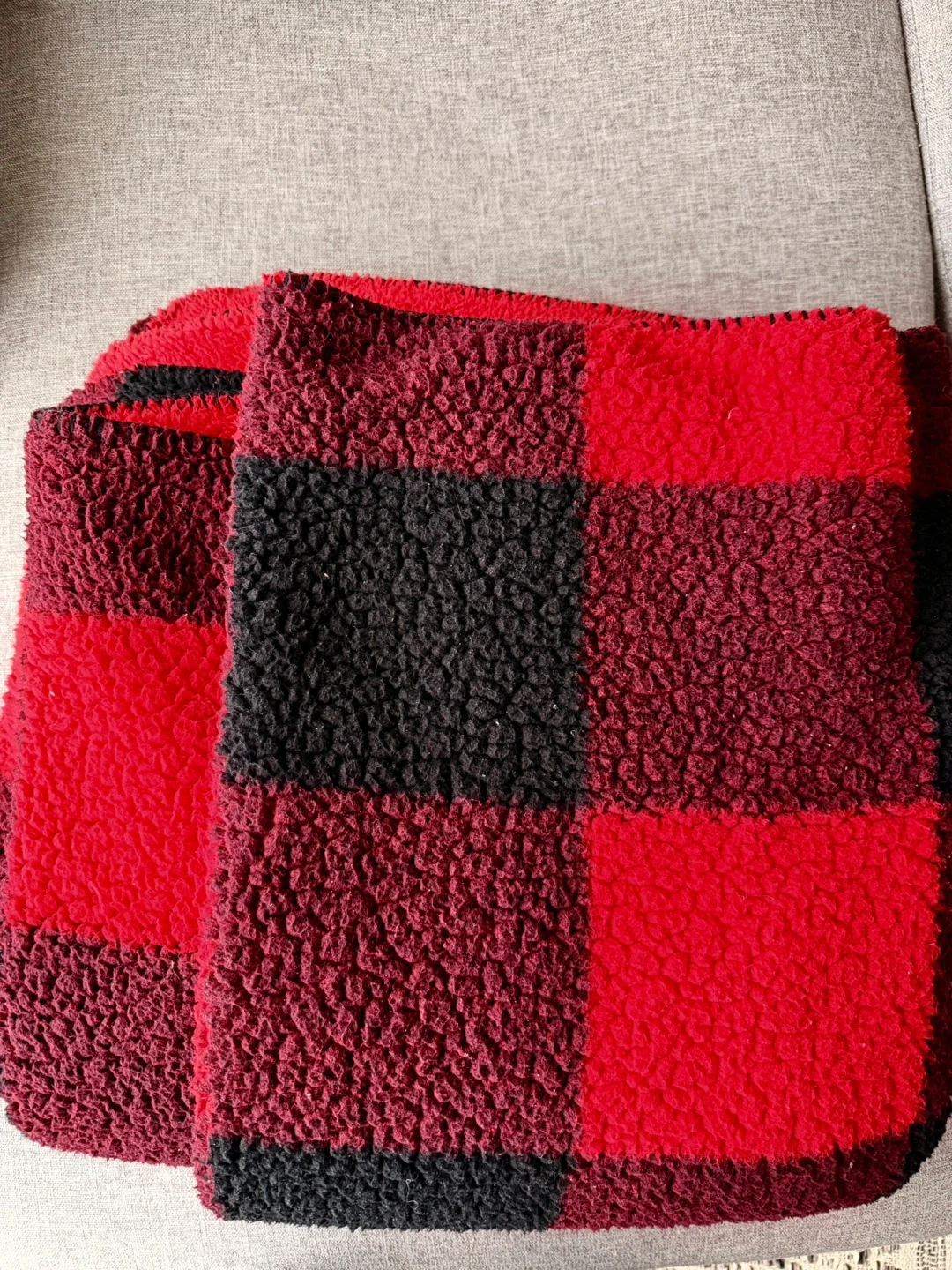 Cozy sherpa blanket with a classic buffalo check pattern. It's made of 100% polyester for a soft and warm feel. This blanket is perfect for snuggling up on the couch or adding extra warmth to your bed.
