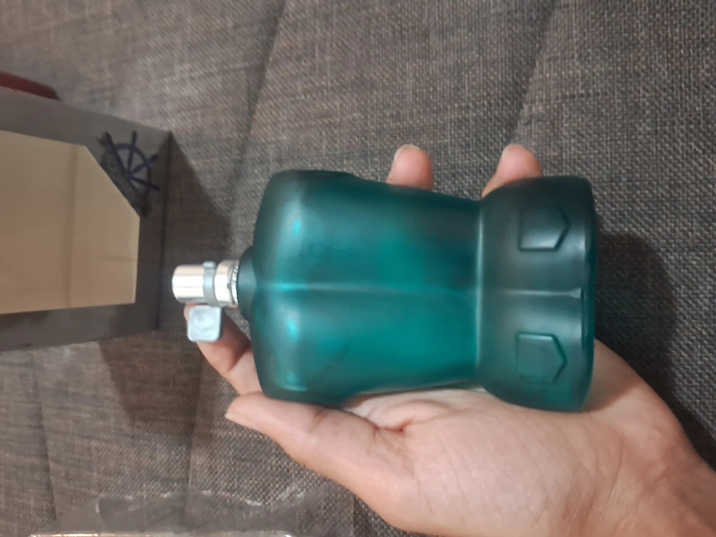 This is a bottle of GIVE YOU HOMME Aqua Man Eau de Toilette. It's a 3.4 fl oz spray. The bottle's design resembles a male torso. Includes original box.