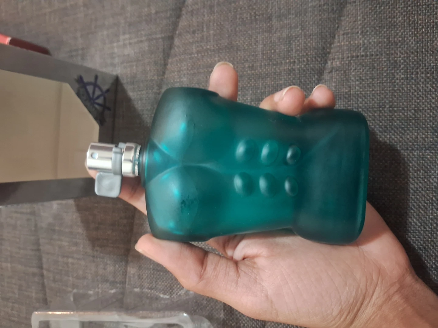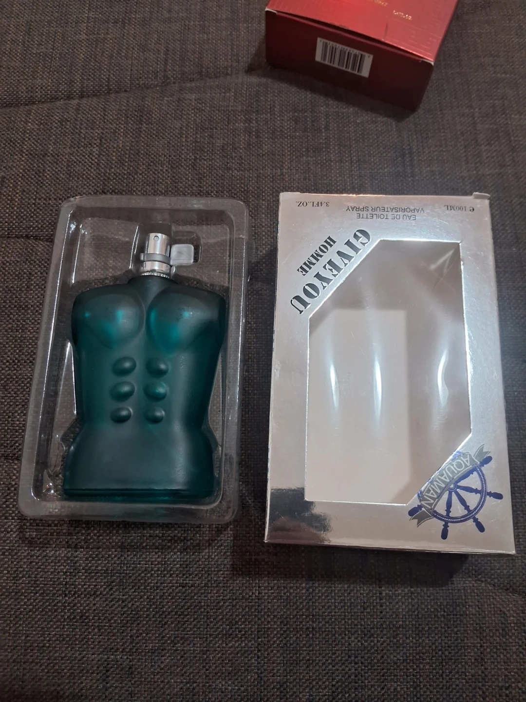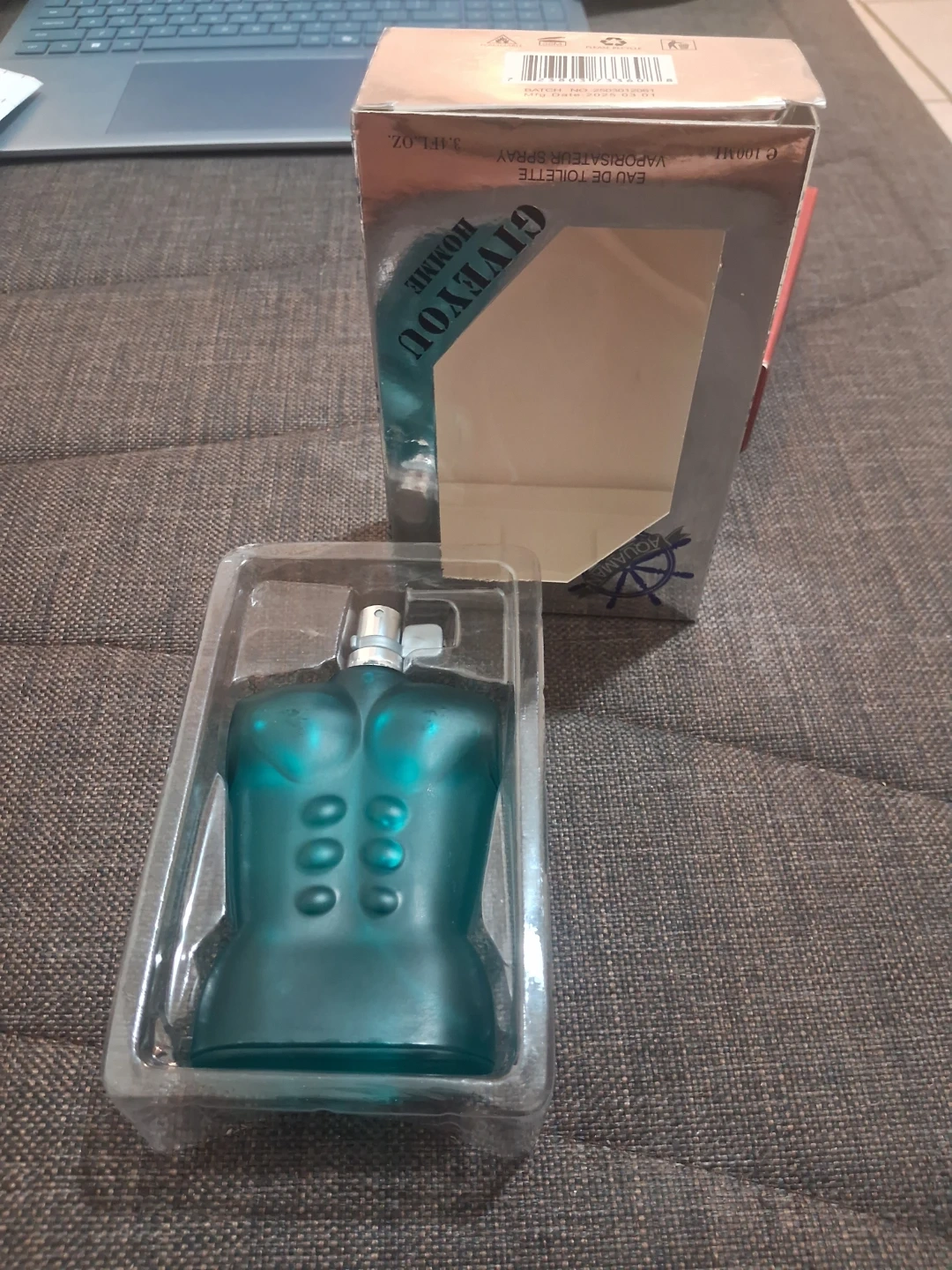This is a bottle of GIVE YOU HOMME Aqua Man Eau de Toilette. It's a 3.4 fl oz spray. The bottle's design resembles a male torso. Includes original box.