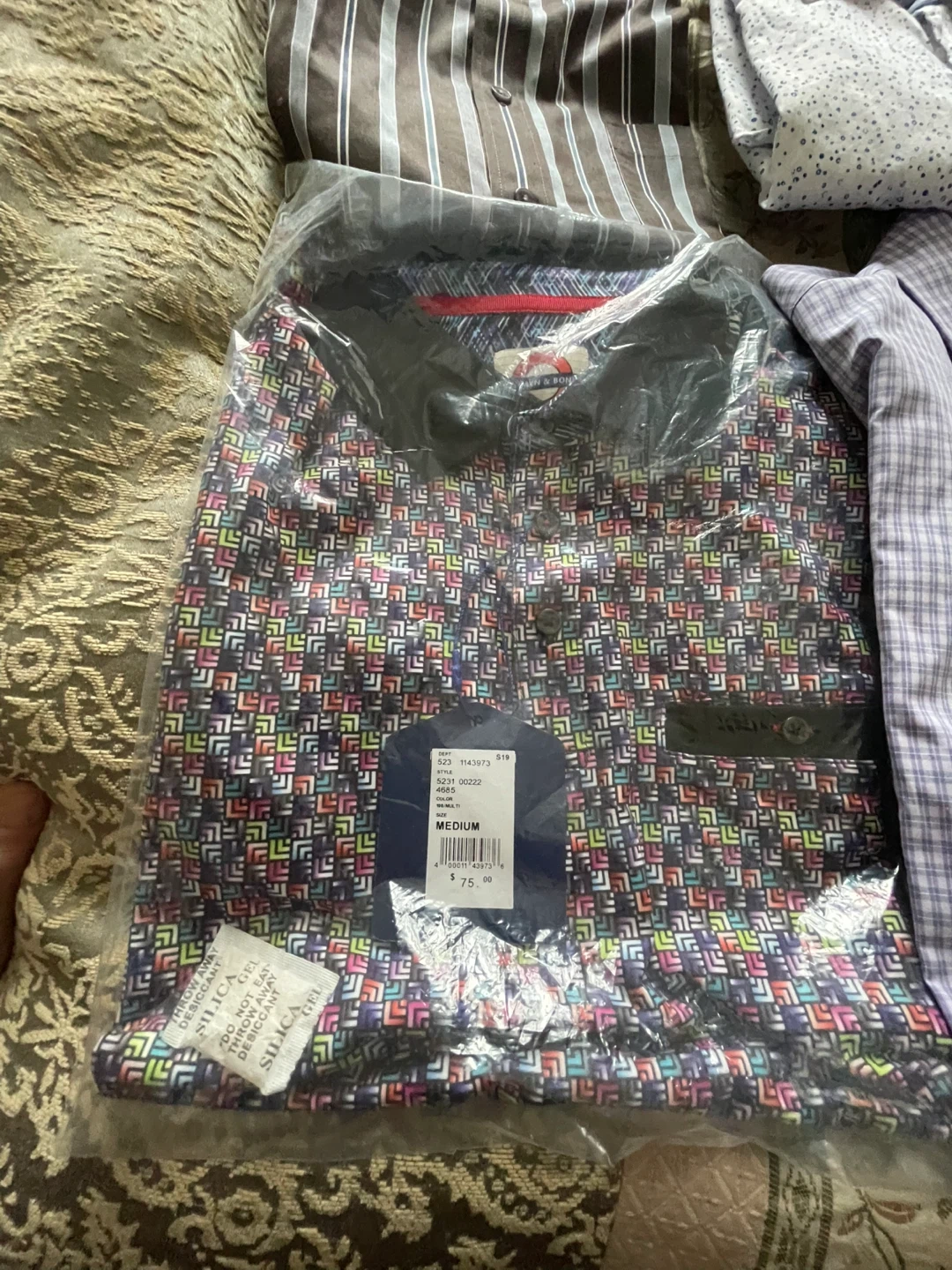 This bundle includes 12!men's dress shirts with various patterns and colours. They are button-downs.shirts Many different brands are represented here, suitable for everyday wear or special occasions buying more than 3 will give a discount these dress shirts never been worn given as a gift down sizing only take cash no e-transfers thank you