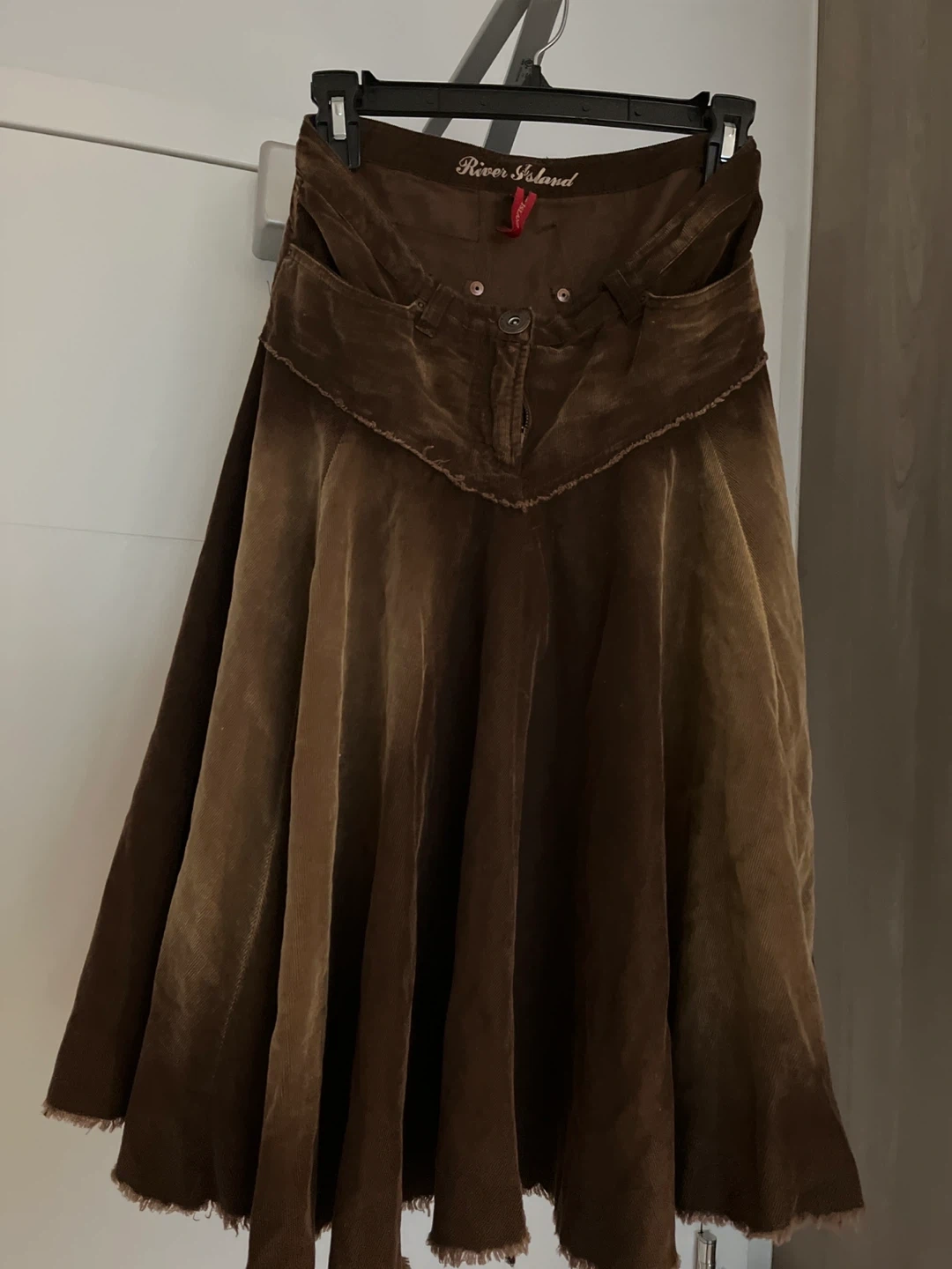 Brown corduroy A-line skirt from River Island. It has a button and zip closure with two front pockets. The hem is frayed.