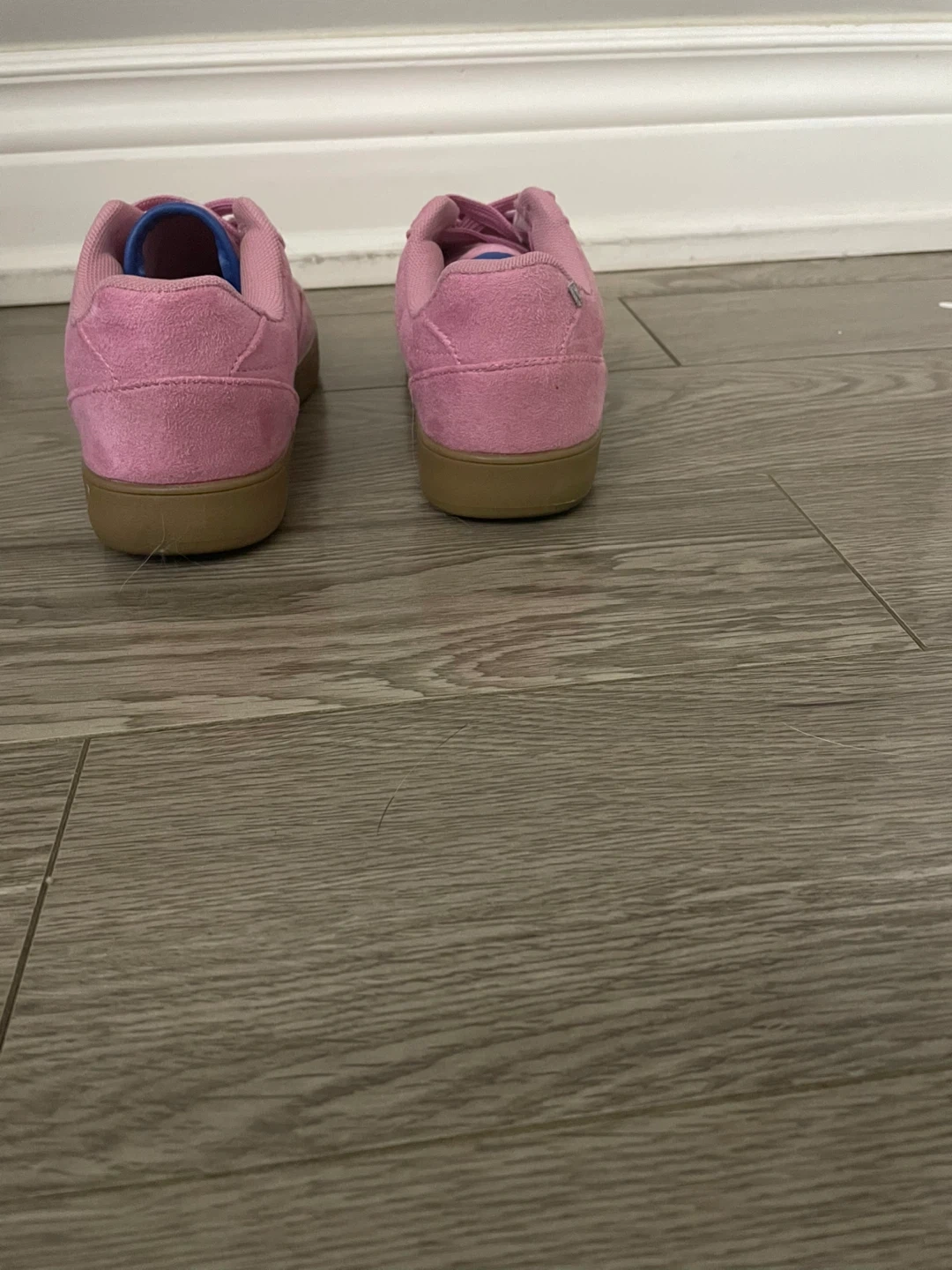 These pink suede sneakers feature blue accents and a gum sole. They're comfy and stylish. Good for casual wear! Pick up only. Cash only. Worn twice. Feels like you're walking on a cloud.