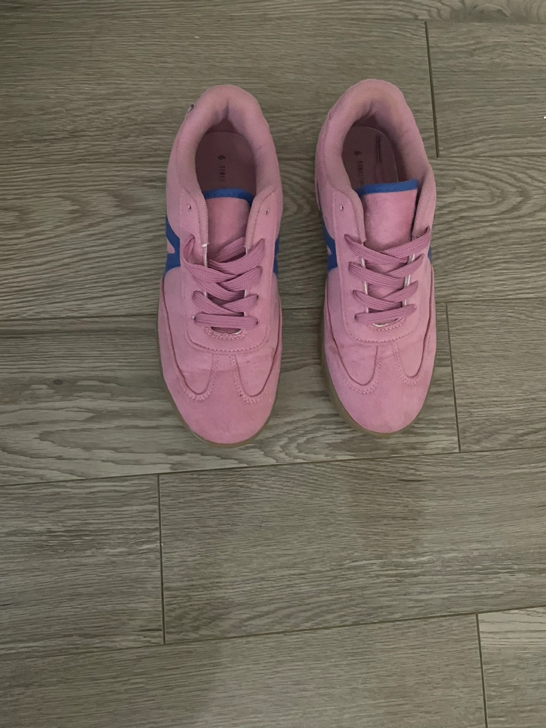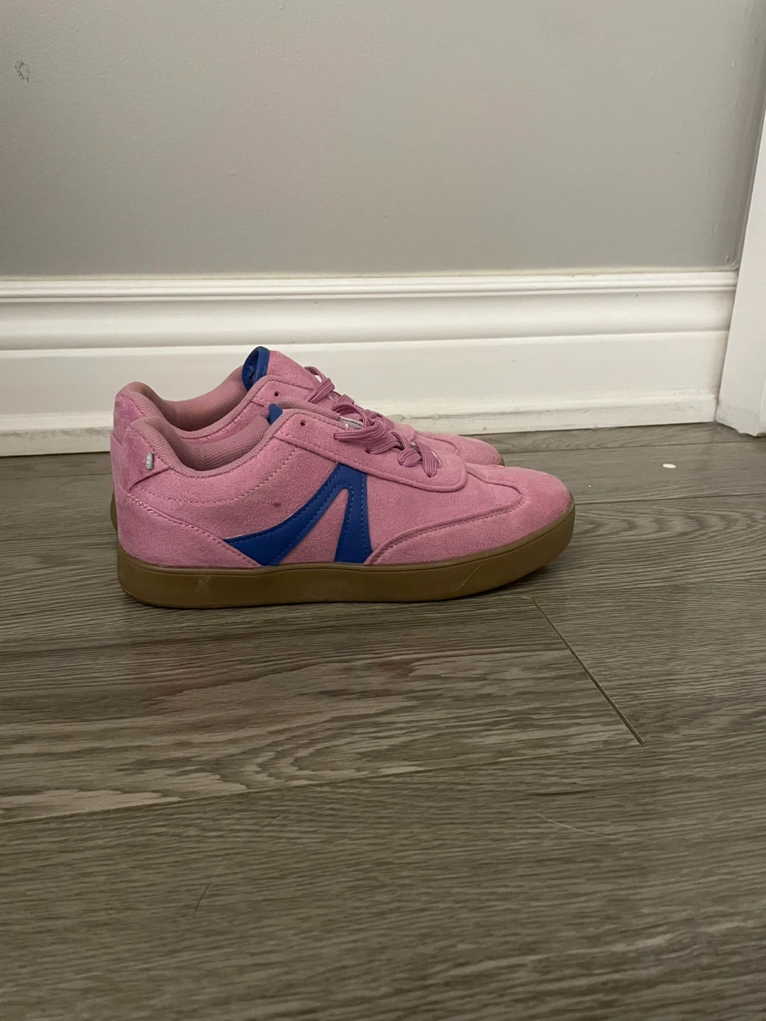 These pink suede sneakers feature blue accents and a gum sole. They're comfy and stylish. Good for casual wear! Pick up only. Cash only. Worn twice. Feels like you're walking on a cloud.