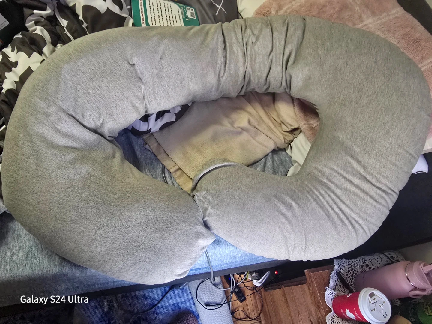Leachco Comfy Coop grey nursing and pregnancy pillow. Soft, supportive, and machine washable cover.