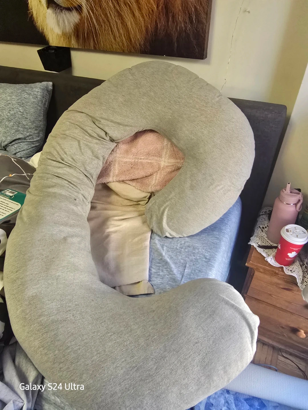 Leachco Comfy Coop grey nursing and pregnancy pillow. Soft, supportive, and machine washable cover.