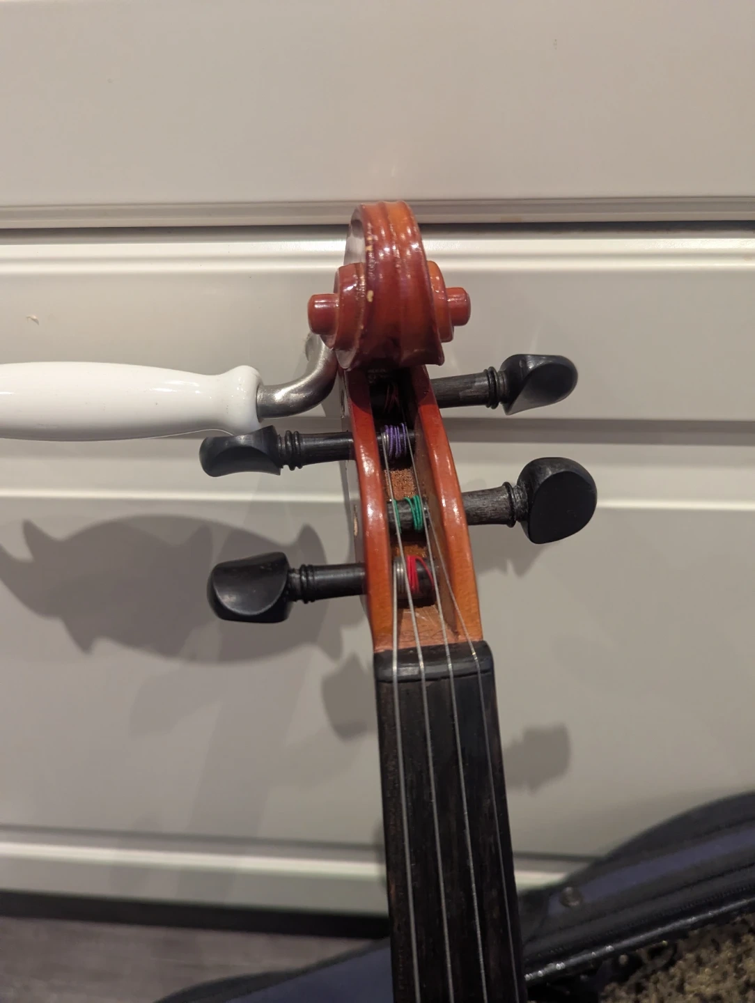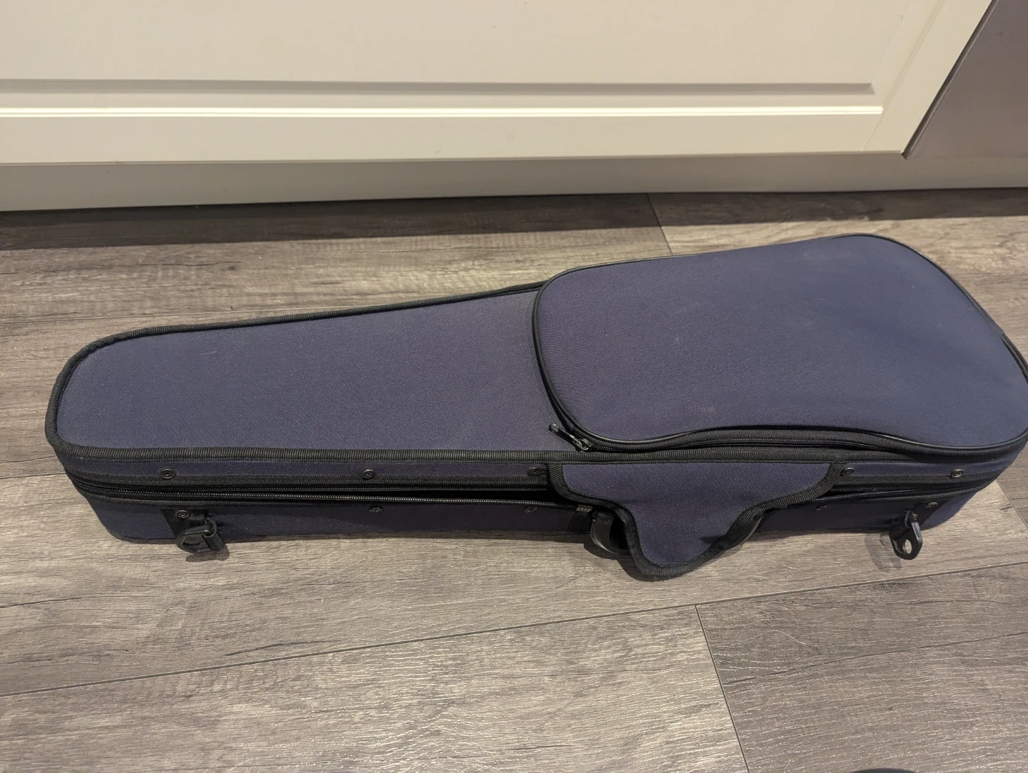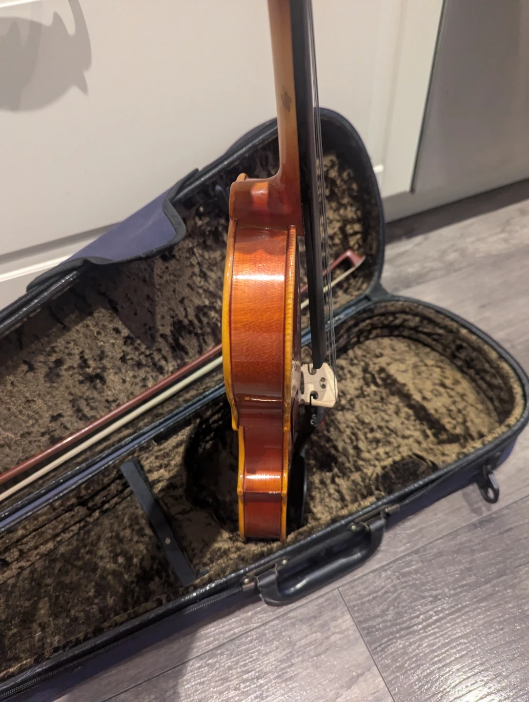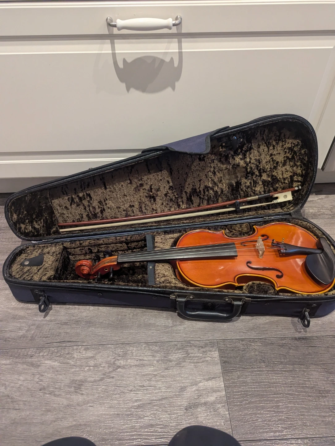 This is a used violin complete with a bow and its hard case. It's a standard string instrument for aspiring musicians. The case is made of dark blue fabric with a plush interior to protect the violin.recently tuned