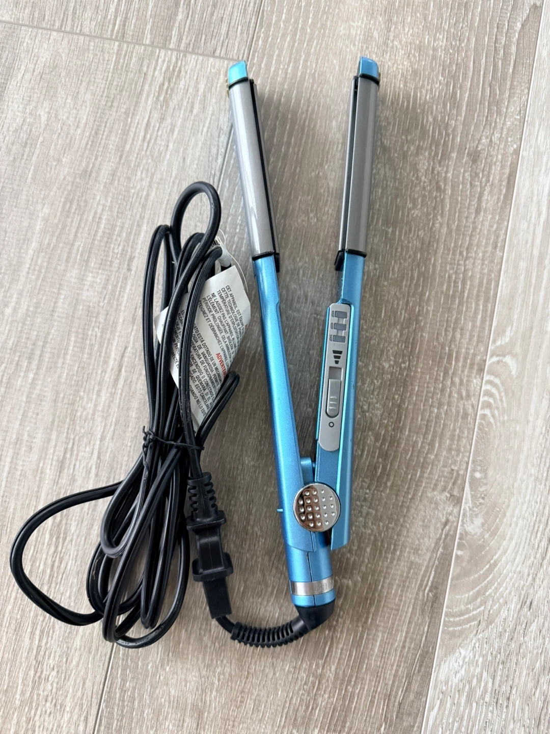 This BaBylissPRO Nano Titanium flat iron is a professional styling tool. It's designed for straightening and styling hair. There is a slight scratch on the handle due to wear and tear.