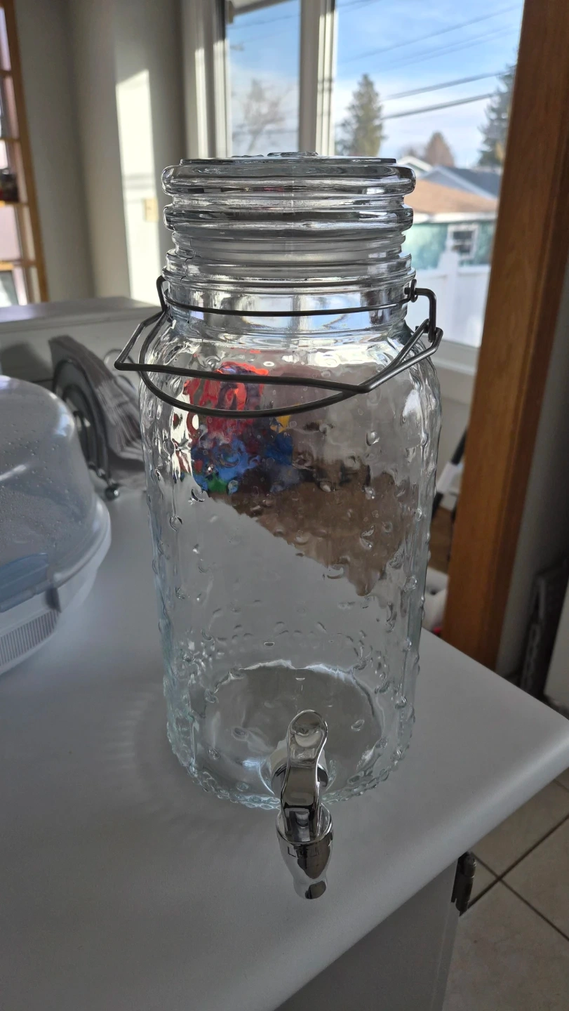 This is a clear glass beverage dispenser with a metal spigot. It has a textured pattern on the exterior. It's perfect for parties or gatherings. Capacity is approximately 1.5 gallons.