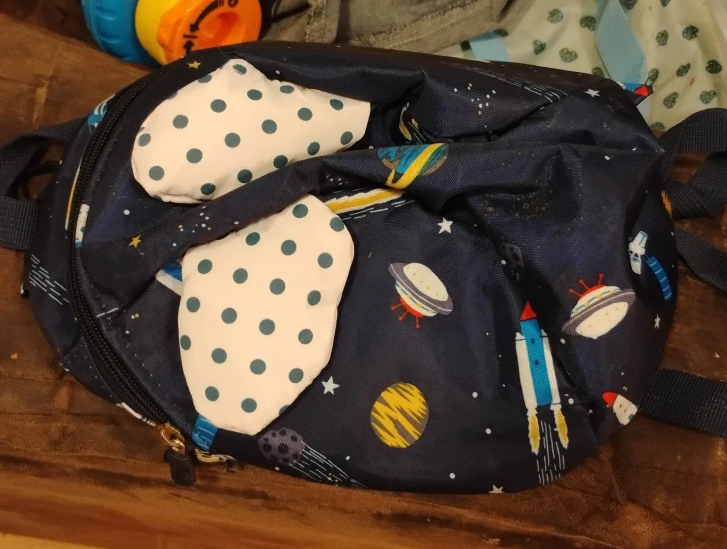 This navy blue backpack features a fun all-over space print with rockets, planets, and UFOs. It has cute bunny ears on the front, perfect for little explorers! Durable material for everyday use.