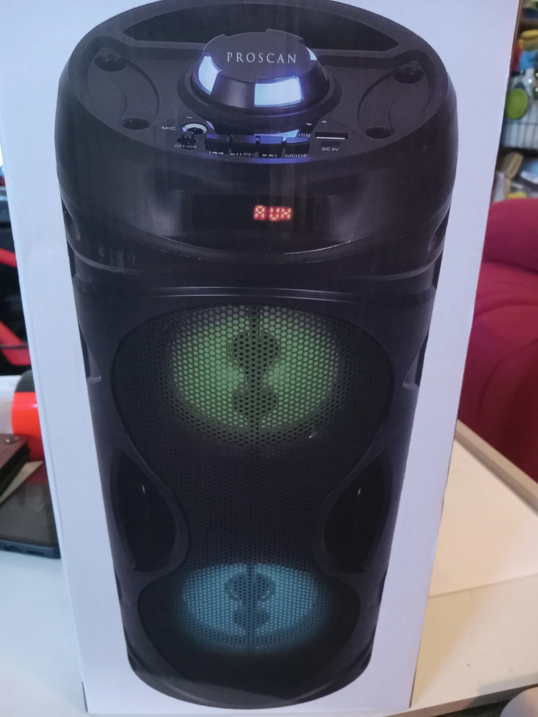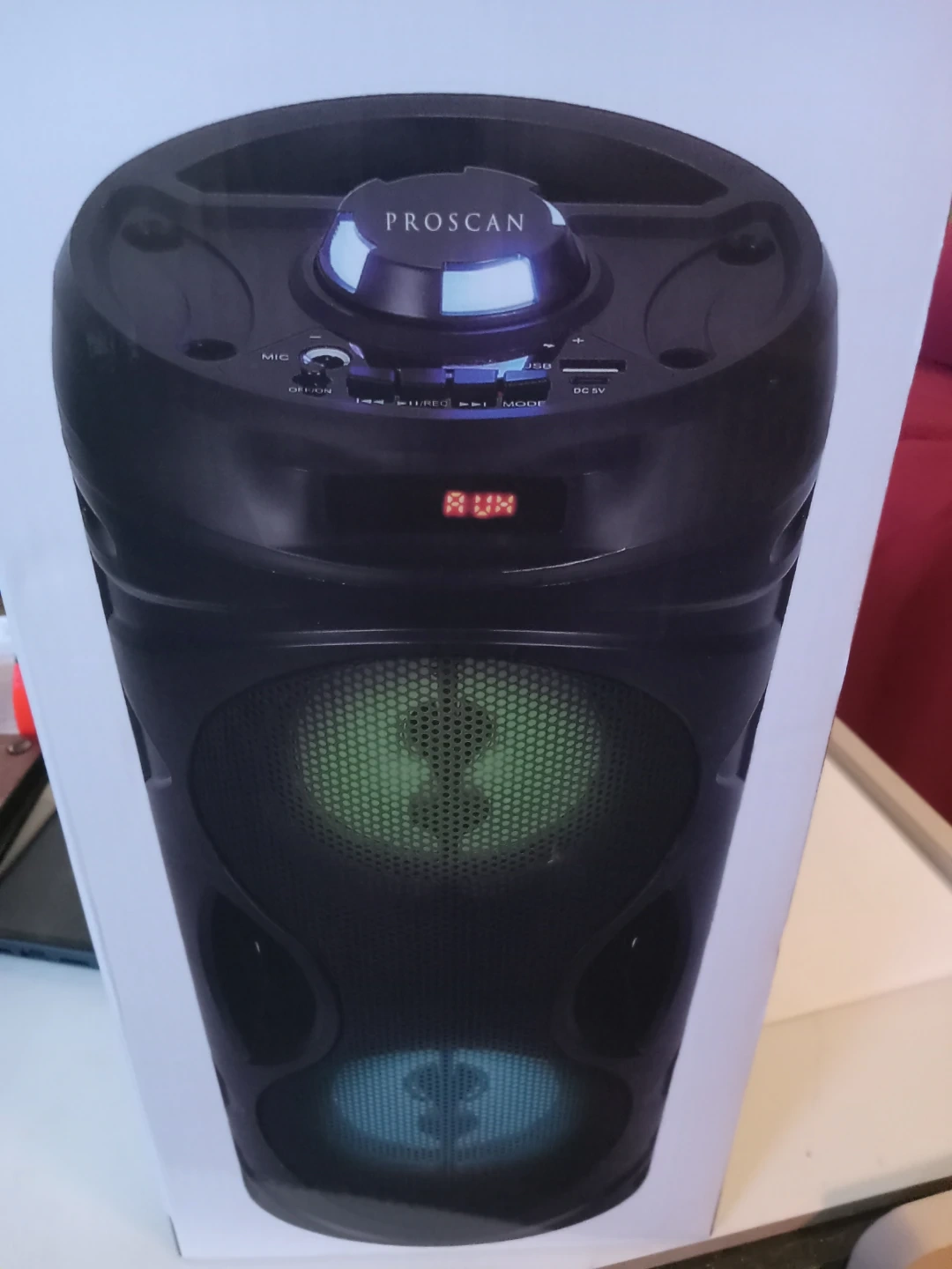 Portable party speaker with LED lights. Built-in rechargeable battery for use anywhere. Includes FM radio. Enjoy music and lights together!
