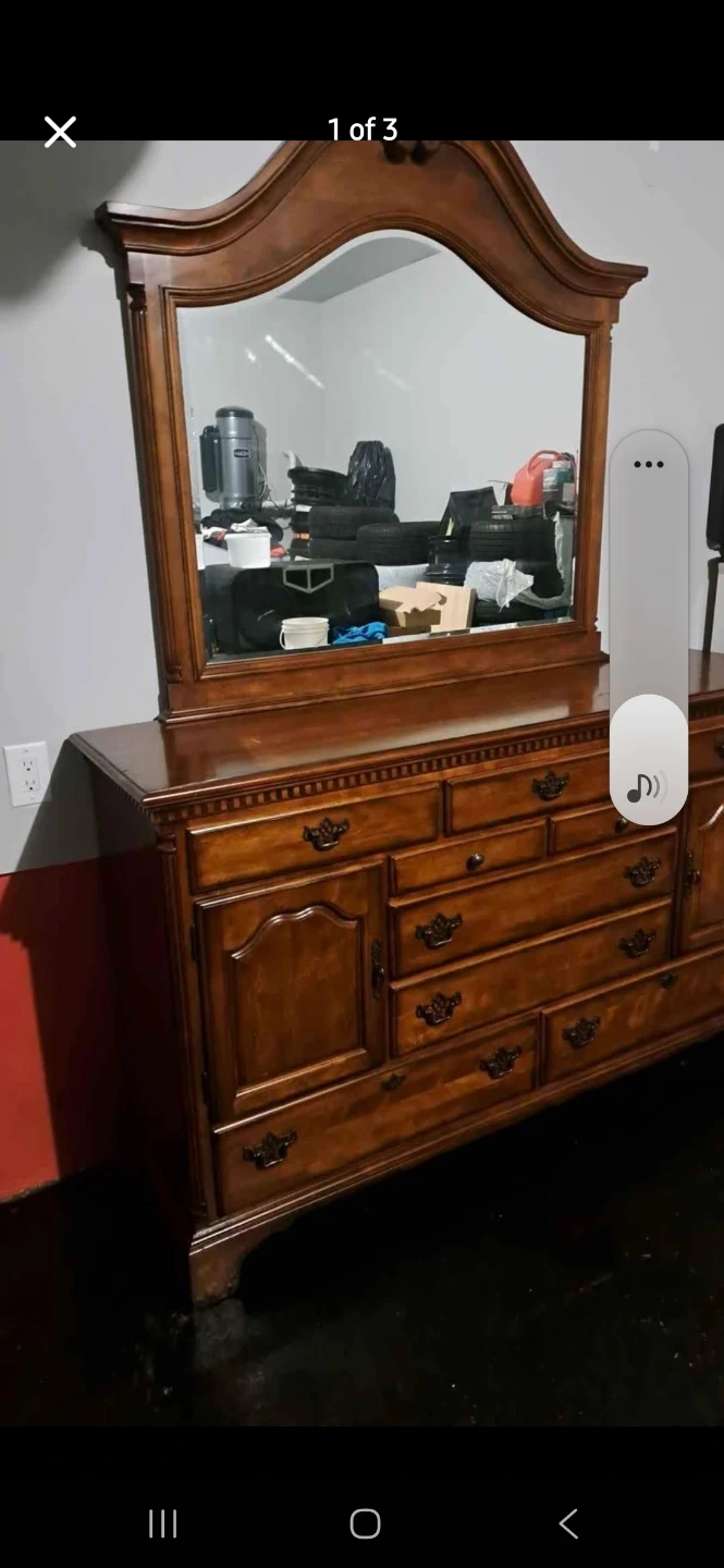 This is a wooden dresser with a matching mirror. It offers ample storage with multiple drawers and cabinet space. The rich wood finish complements many bedroom decors.